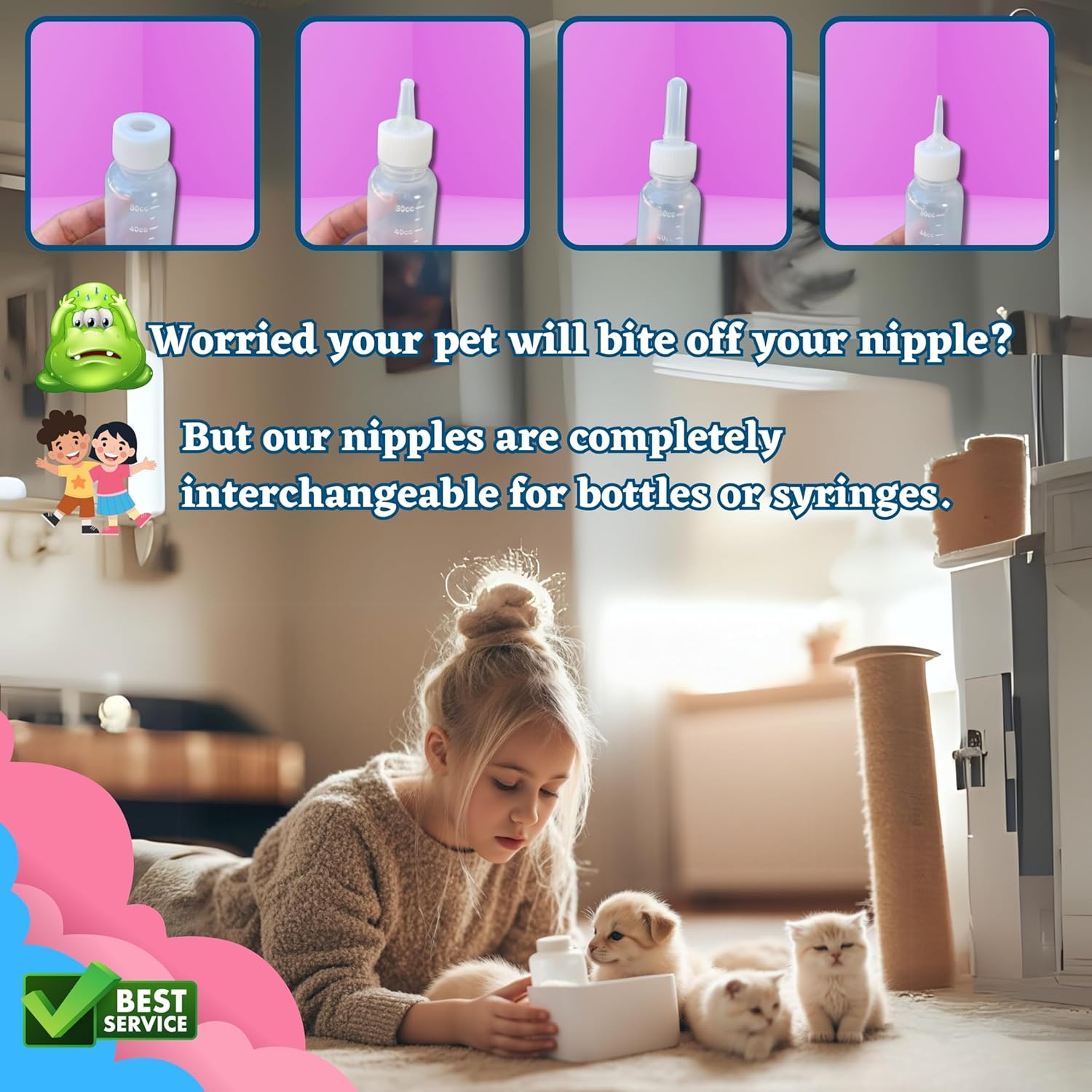 - Specialized Nursing for Kittens and Puppies Ensure optimal health with our kitten nursing and kitten bottle feeding tools. Each kitten nipple and kitten milk feeder is designed for comfort, while kitten nipples for bottle feeding and baby kitten bottles for nursing provide a secure fit. The kit also includes kitten bottle nipples and kitten nursing nipples, making feeding products for kittens effective and easy. For puppies, we offer puppy nipples for nursing newborn pets, ensuring everyone is well-fed.