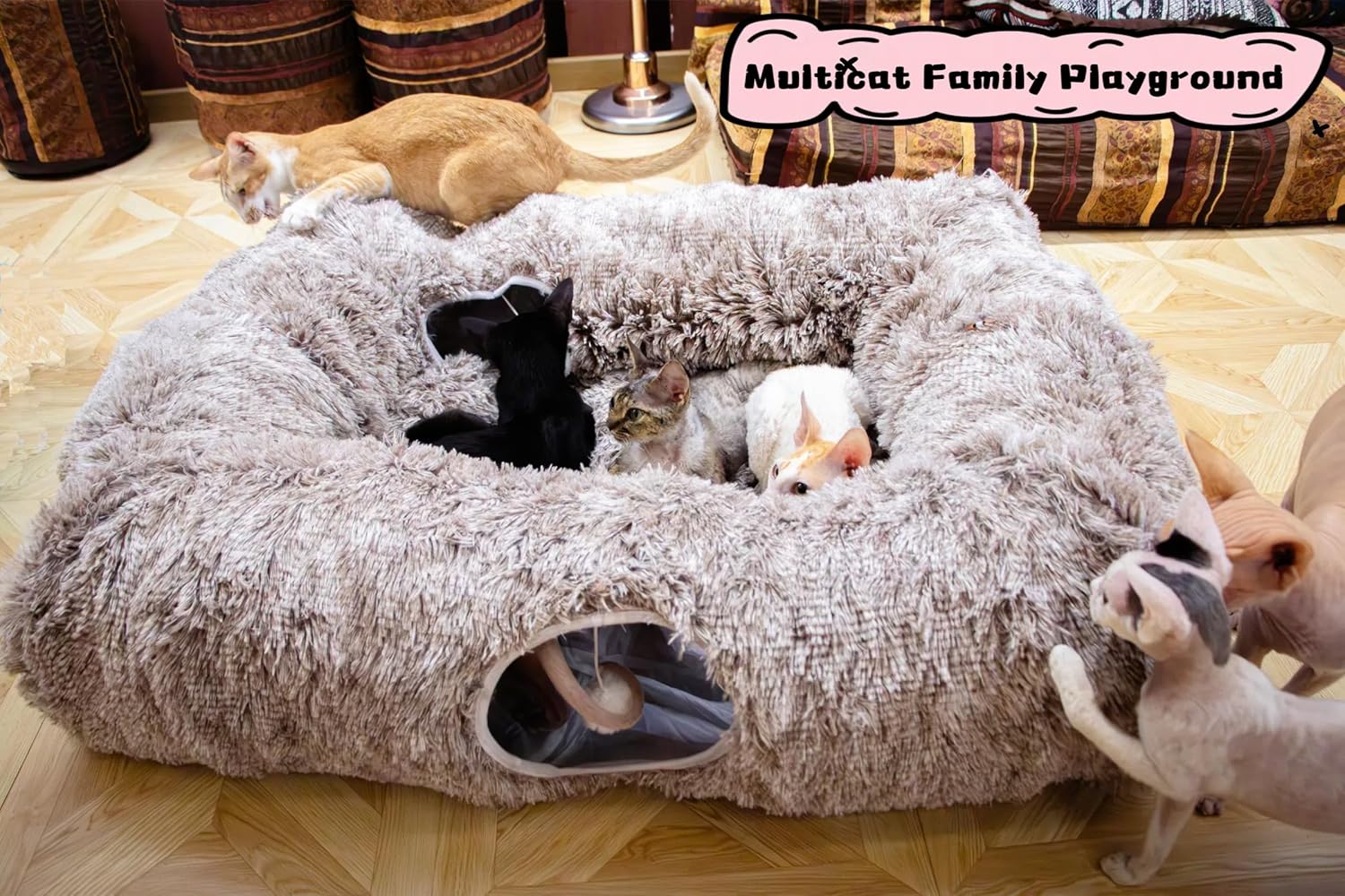 - Interactive and Fun: With four tunnel openings and dangling balls, this bed encourages active play and human-pet interaction, elderly or disabled cats cat can easily conduit the center mat without jumping over the tunnel, providing untold entertainment for cats.