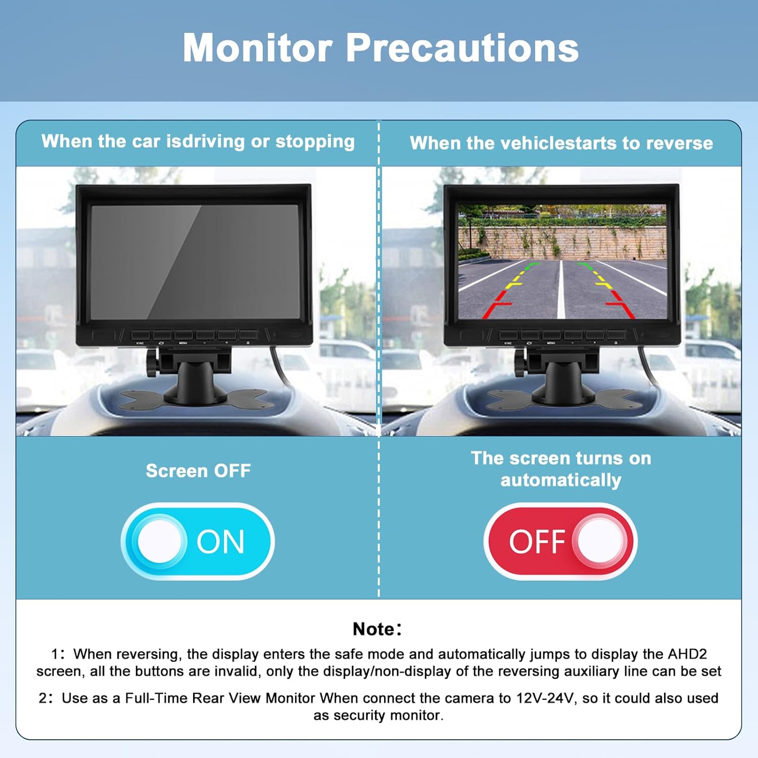 - Wide Viewing Angle and Automatic Parking Display: This bakcup camera for truck has a 110° horizontal and 130° diagonal viewing angle with no blind spots. At the same time, when reversing, the display enters the safety mode and automatically jumps to the AHD2 screen to ensure driving safety
