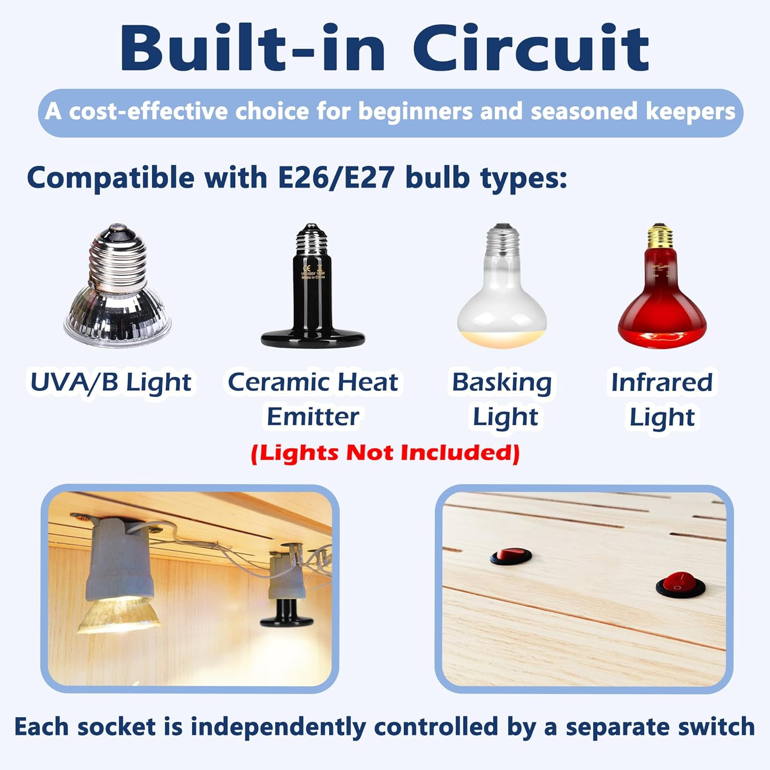 - 【Integrated Bulb Sockets】Take the hassle out of lighting with built-in bulb sockets and switches. Feature two (the larger 40-inch and 48-inch models feature 3) sockets compatible with E26/E27 bulbs (bulbs not included), supporting heating, daylight, and night lighting needs. Simple to install, these pre-installed sockets saves money on lamps and make it effortless to create the ideal environment for your reptiles.