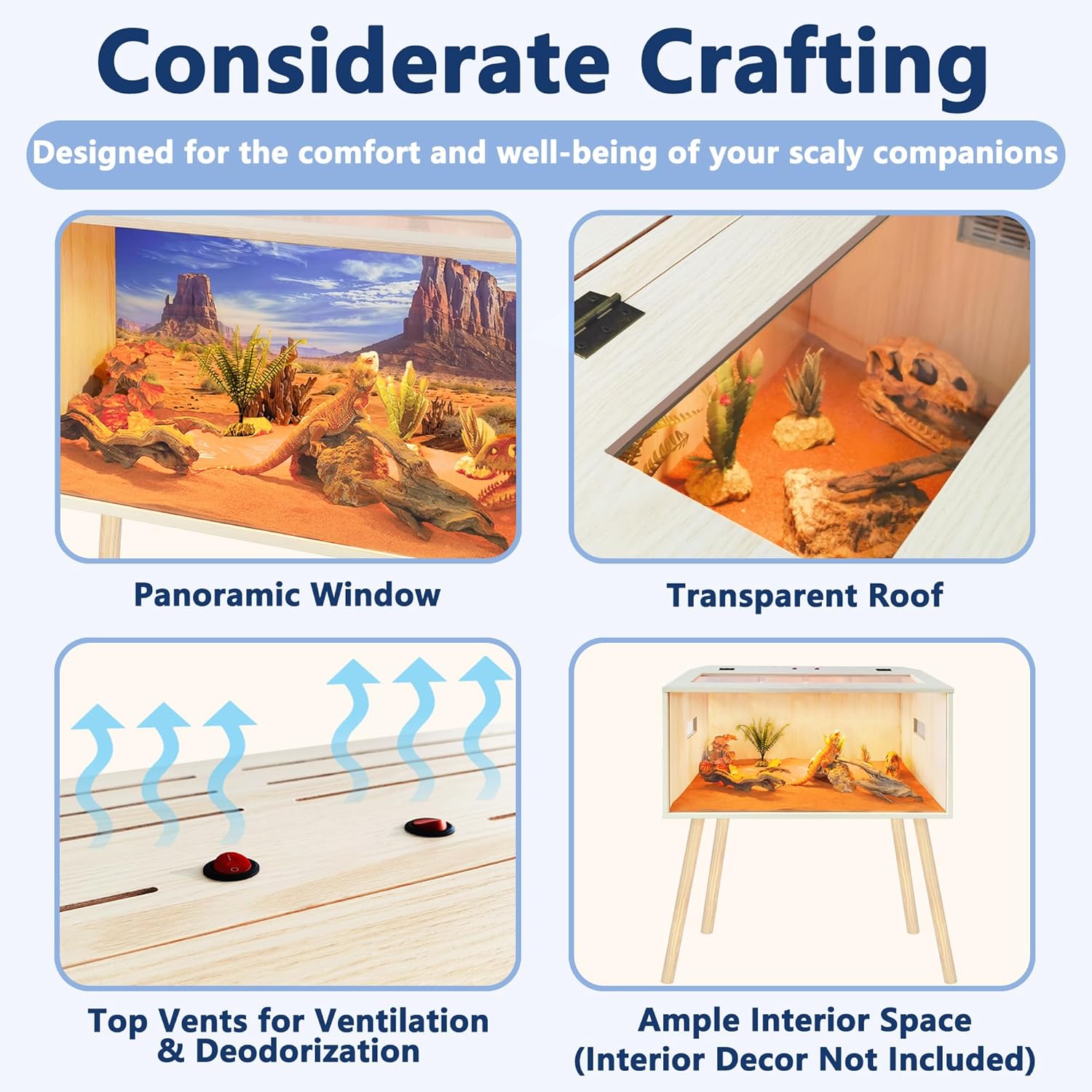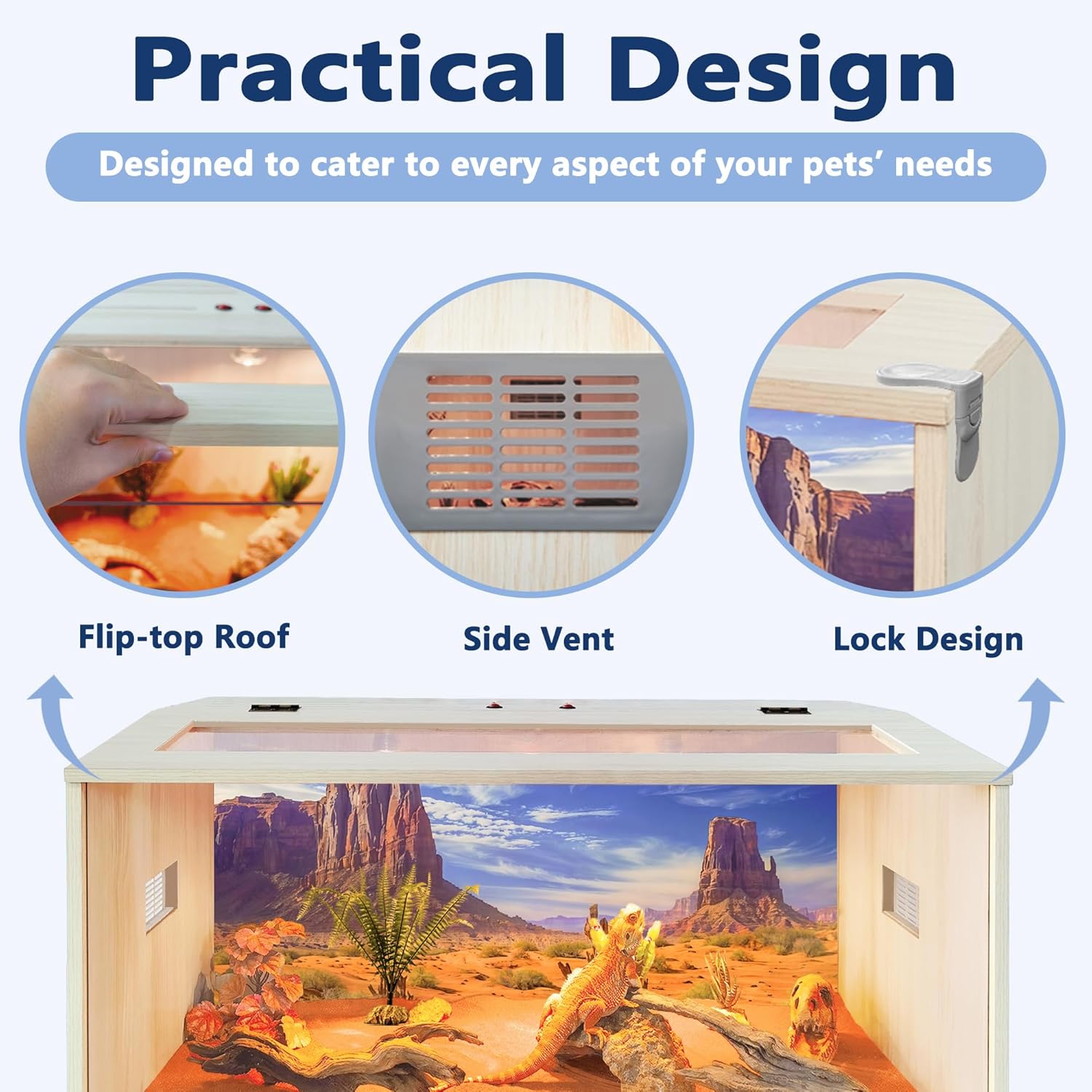 - 【Comfortable Habitat】Provide your reptiles with a spacious, secure, and comfortable home. This enclosure features a front acrylic panel for ultra-clear visibility, allowing you to observe your pets in their natural environment. Equipped with top and side ventilation, it ensures excellent airflow to keep your reptiles healthy. This wood habitat also represents greater heat retention than normal glass and mesh tank, which is good for your pets like lizard, gecko and snakes! Important Note: This habitat is not designed to hold water.