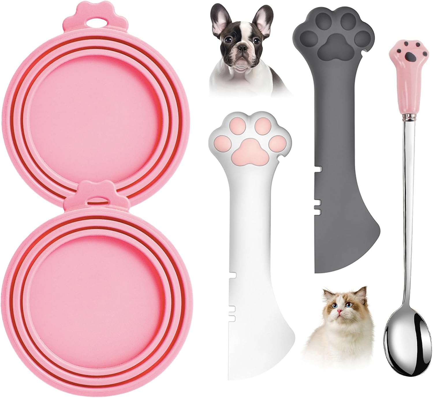 - Versatile Set: This set includes 2 silicone dog/cat food can lids, 2 cute paw-shaped cat food spoon spatulas can opener, and 1 stainless steel spoon for wet food cans