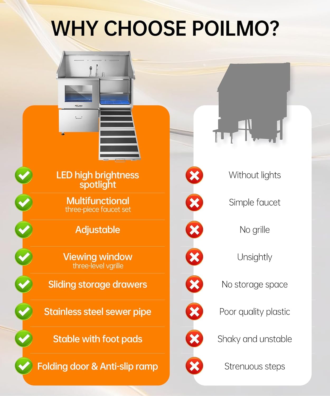 - Innovative and Practical Design: The POLIMO dog grooming station features multiple outstanding design elements: ①IP65 Waterproof high-brightness LED spotlight. ② Grade A tempered glass observation window. ③ The bathtub’s side panels feature a curved slide design, making it easier to operate④ Two-piece floor grid, adjustable to three different heights. ⑤ Sliding storage drawer for organized storage. ⑥ Multi-function faucet and showerhead, adjustable to left, center, or right positions.⑦ Two drainage options are available: one with a pet hair catcher and another stainless steel drain pipe featuring an odor-blocking S-trap design