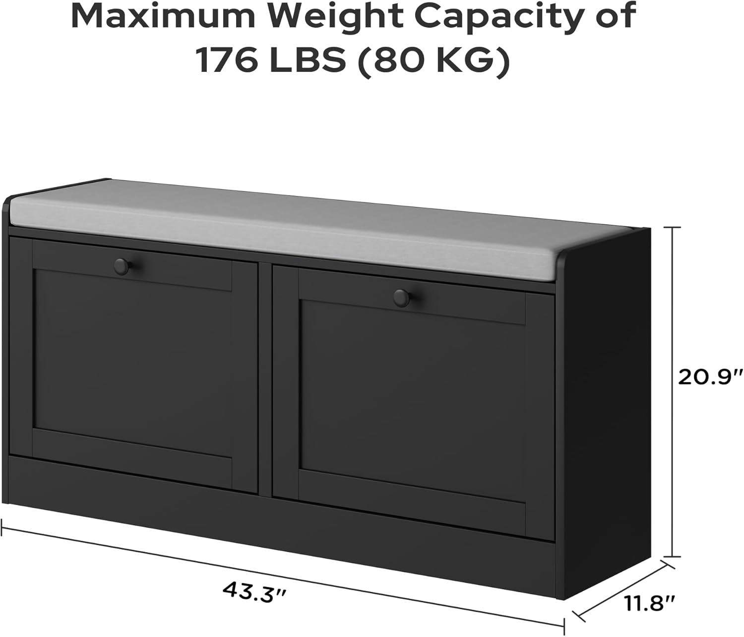 - Flip Drawers Shoe Bench: Overall Dimension of the hidden shoe storage: 43.3" W x 11.7" D x 20.9" H. Featuring with 2 flip drawers, the shoe rack bench adopts a space-saving flip drawer design, which is easy to open and close. The entry way bench helps maintain a clutter-free space while adding a touch of style to your entryway.