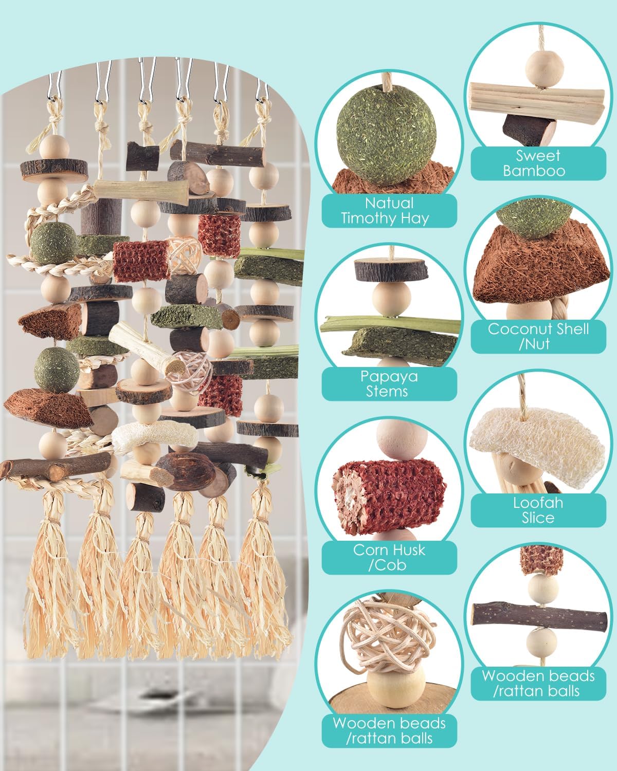 - Natural Materials: DBNESS small animal toys are crafted from 100% natural materials including apple wood, timothy hay, loofah slices, rattan balls, nuts, corn husks/cobs, coconut shells, sweet bamboo, and papaya stems. These bunny toys for bunnies provide safe play and chewing opportunities for your lovely pets. These materials are not only fiber-rich, which helps clean your pet's teeth and promote digestion, but they also aid in exercising and relieving stress