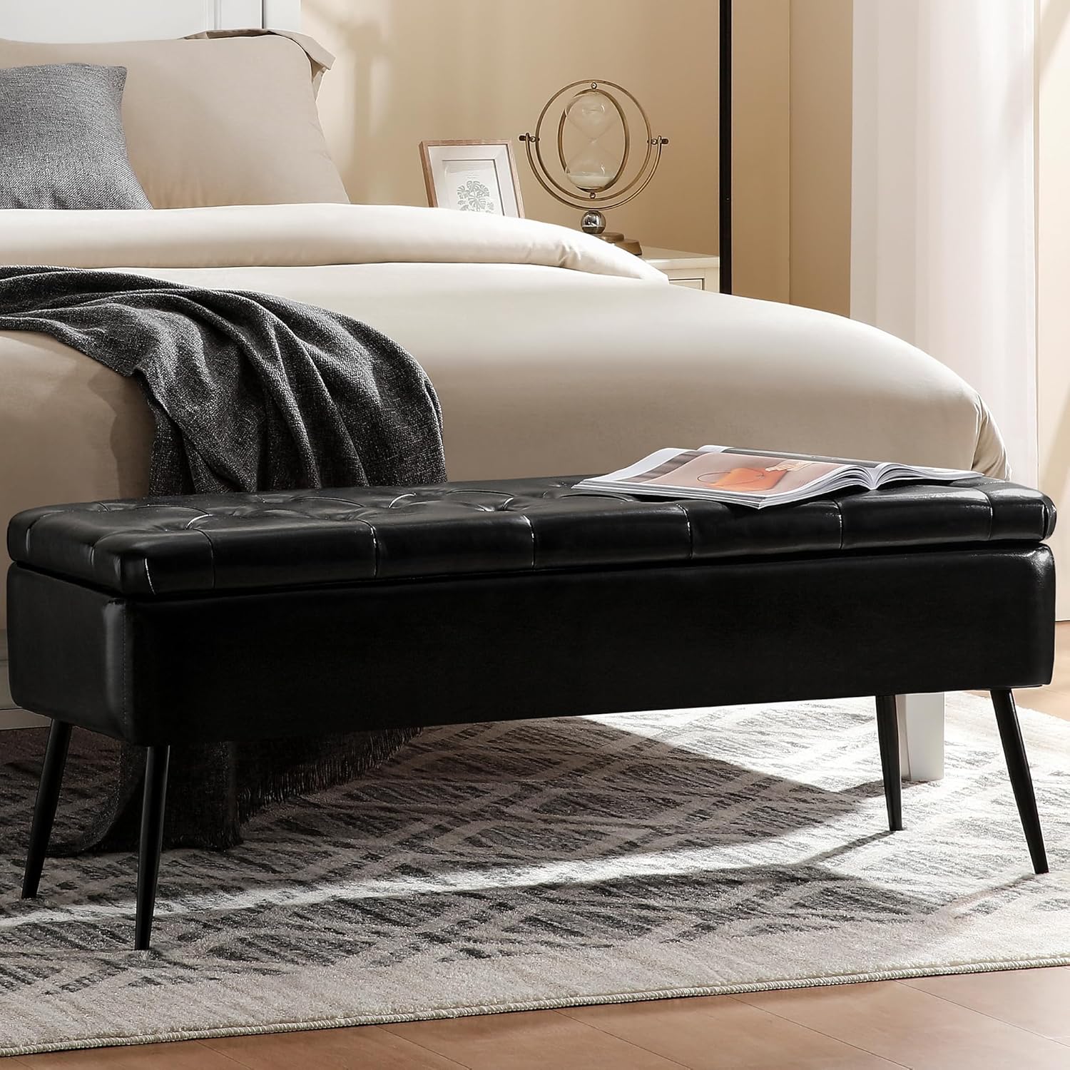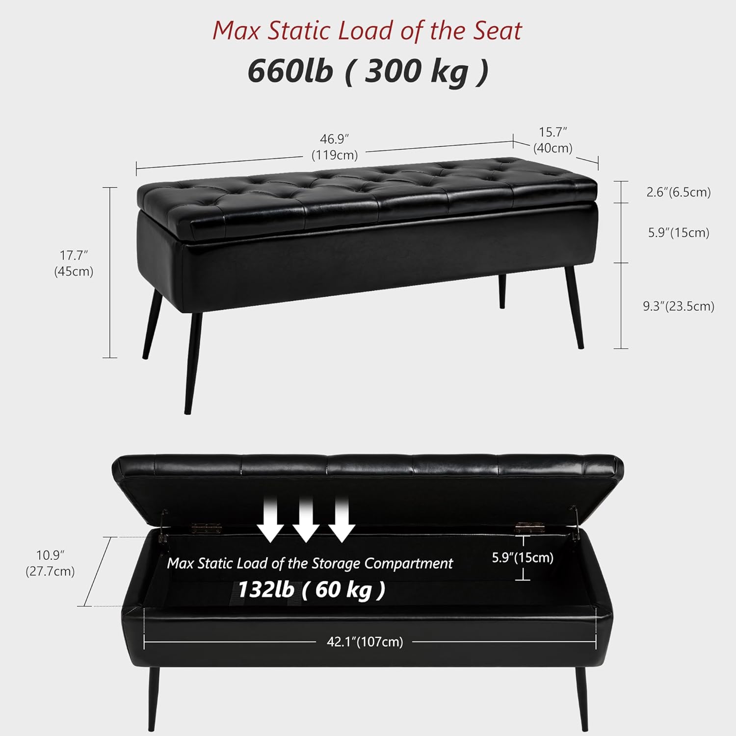 Leather Storage Ottoman Bench,End of Bed Bench for Living Room Bedroom Dinning Room Entryway,Mid-Century Modern,Faux Leather,with Steel Legs,Safety Hinges, Loads 660 lb (with Button, Black)