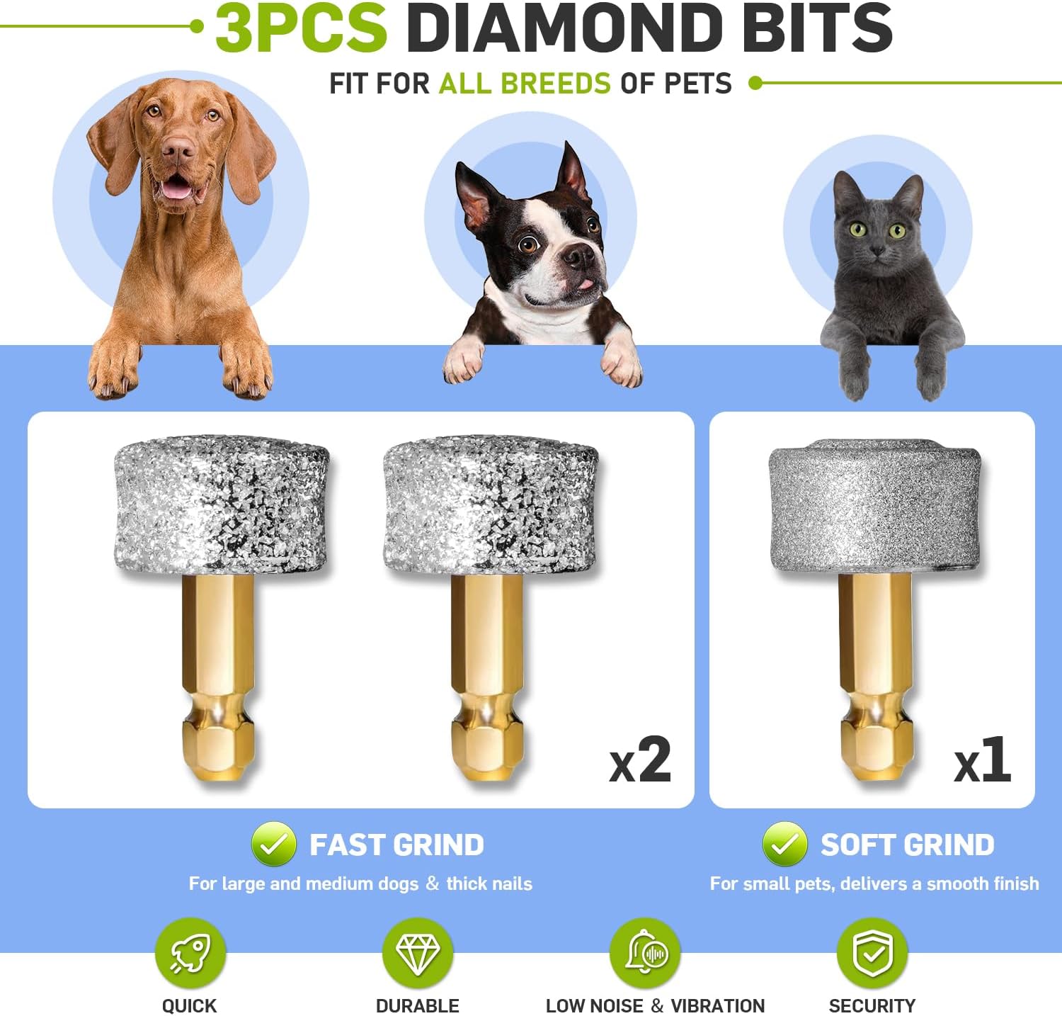 - 🎄🐾【3 Grinding Wheels, 3 Speeds, 3 Ports for All Sizes】Enjoy seamless pet nail care with the professional CADOLS silent dog nail grinder. Boasting a robust 3-speed motor (8000-12000rpm), it effortlessly tackles long and thick nails. Equipped with 3 replacement diamond grinding wheels separately, one super soft, two super hard,plus 3 tailored grinding ports, it caters to large, medium, and small dogs, cats,large breed . This versatile setup offers a comprehensive 360-degree nail grooming experience, ensuring stress-free nail trimming for all your furry friends.