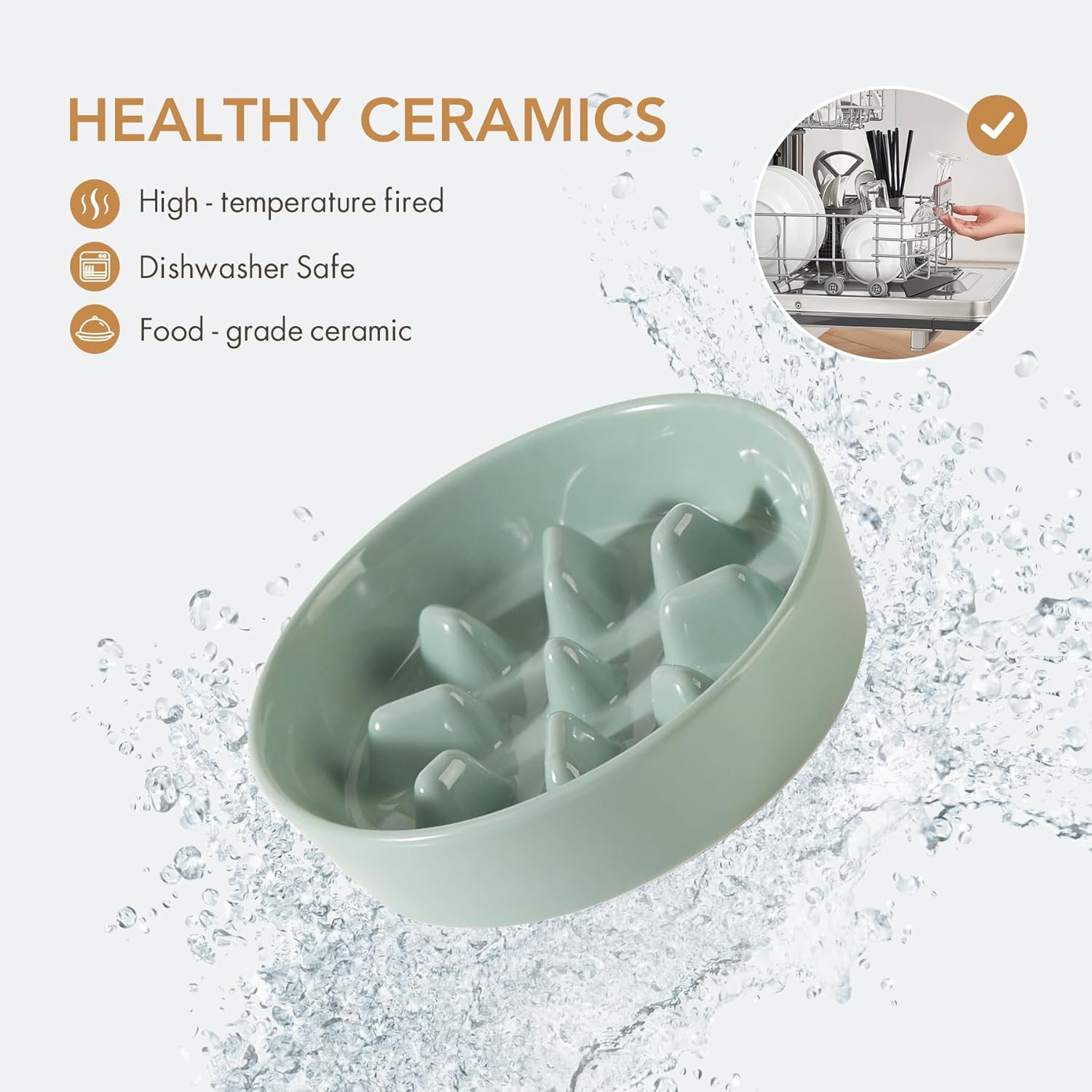 Ceramic 7.3 inch Dog Bowl Slow Feeder, Slow Pet Food Dish for Medium and Small Dog, Stop Bloat, Preventing Choking(Single Bowl, Light Green)