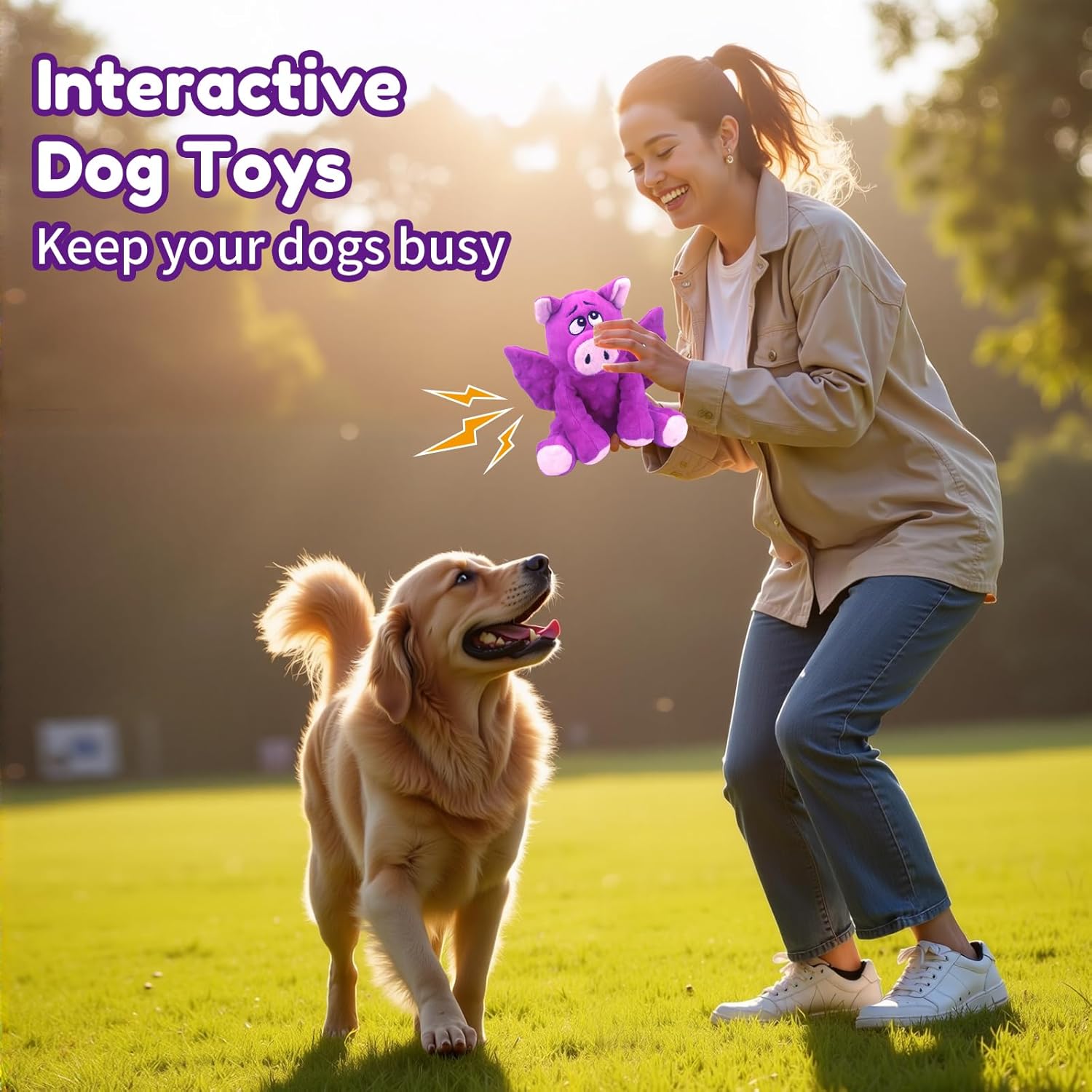 - Interactive Dog Toys: Dog toys for large dogs are a great way to keep your canine companion entertained and free from boredom. The large dog toys can be use in indoor as a play or chew toy, or it also can be use in outoor that can be a training, fetch, interative toys. Our plush dog squeaky toy is an excellent tool for mitigating your dog's anxiety, boredom and depressive behaviors. Designed to keep your dog engaged, to keep them busy and healthy. The dog wags its tail and have a frightfully good time with our squeaky dog toys