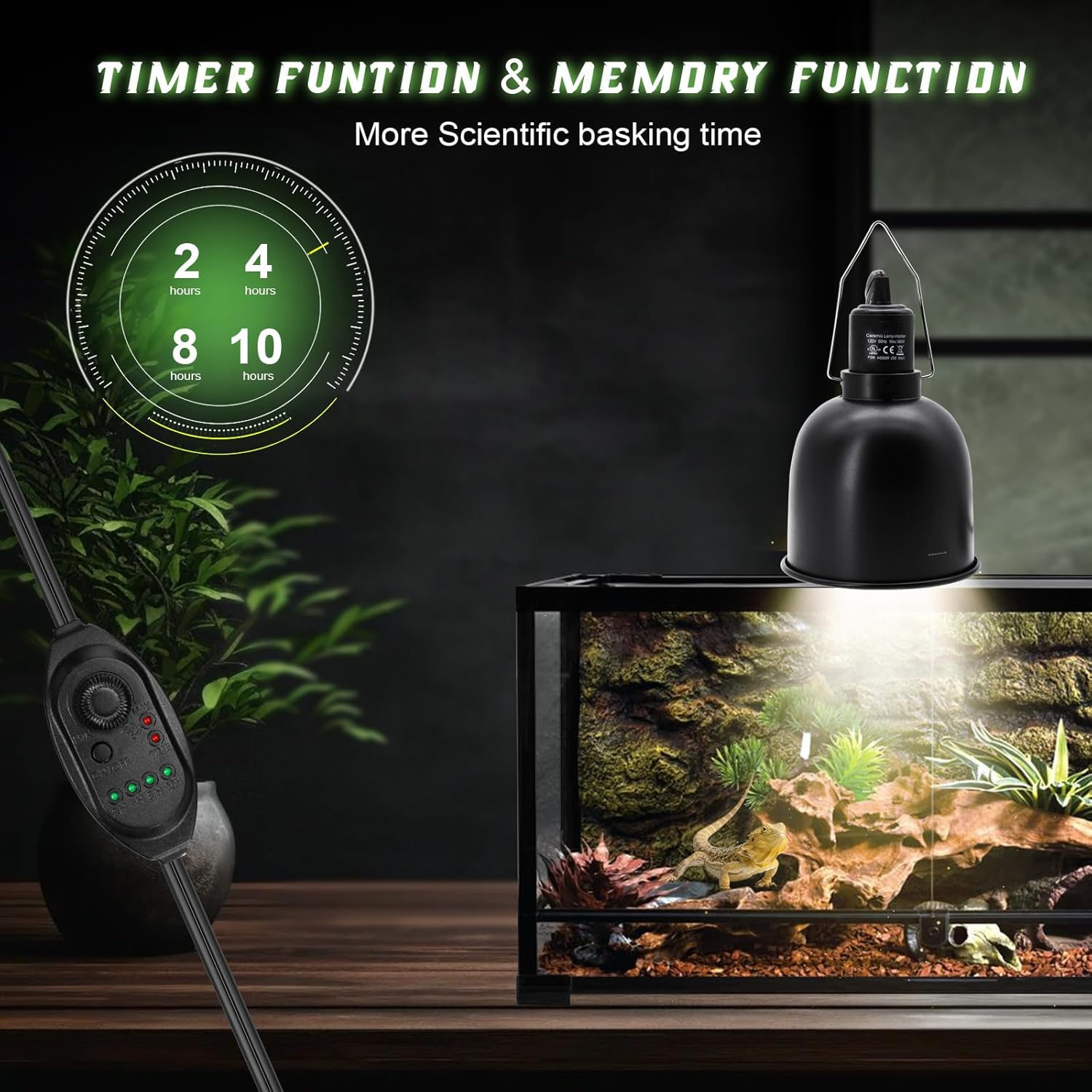 - 2/4/8/10H Timing Mode/24h Cycle Mode: The reptile heat lamp dome with hook has a timer function, set to a specific amount of hours like 2,4,8or 10 hours, very convenient to use. In addition, our deep dome lamp cap have also added 24h cycle function. Timing time is started from the set time, automatic daily cycle.