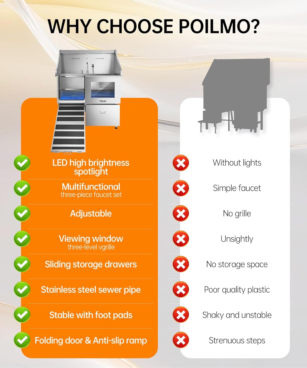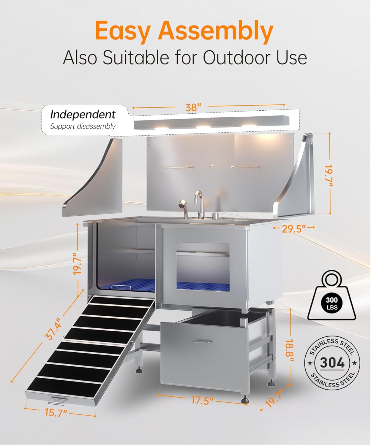 - Innovative and Practical Design: The POLIMO dog grooming station features multiple outstanding design elements: ①IP65 Waterproof high-brightness LED spotlight. ② Grade A tempered glass observation window. ③ The bathtub’s side panels feature a curved slide design, making it easier to operate④ Two-piece floor grid, adjustable to three different heights. ⑤ Sliding storage drawer for organized storage. ⑥ Multi-function faucet and showerhead, adjustable to left, center, or right positions.⑦ Two drainage options are available: one with a pet hair catcher and another stainless steel drain pipe featuring an odor-blocking S-trap design