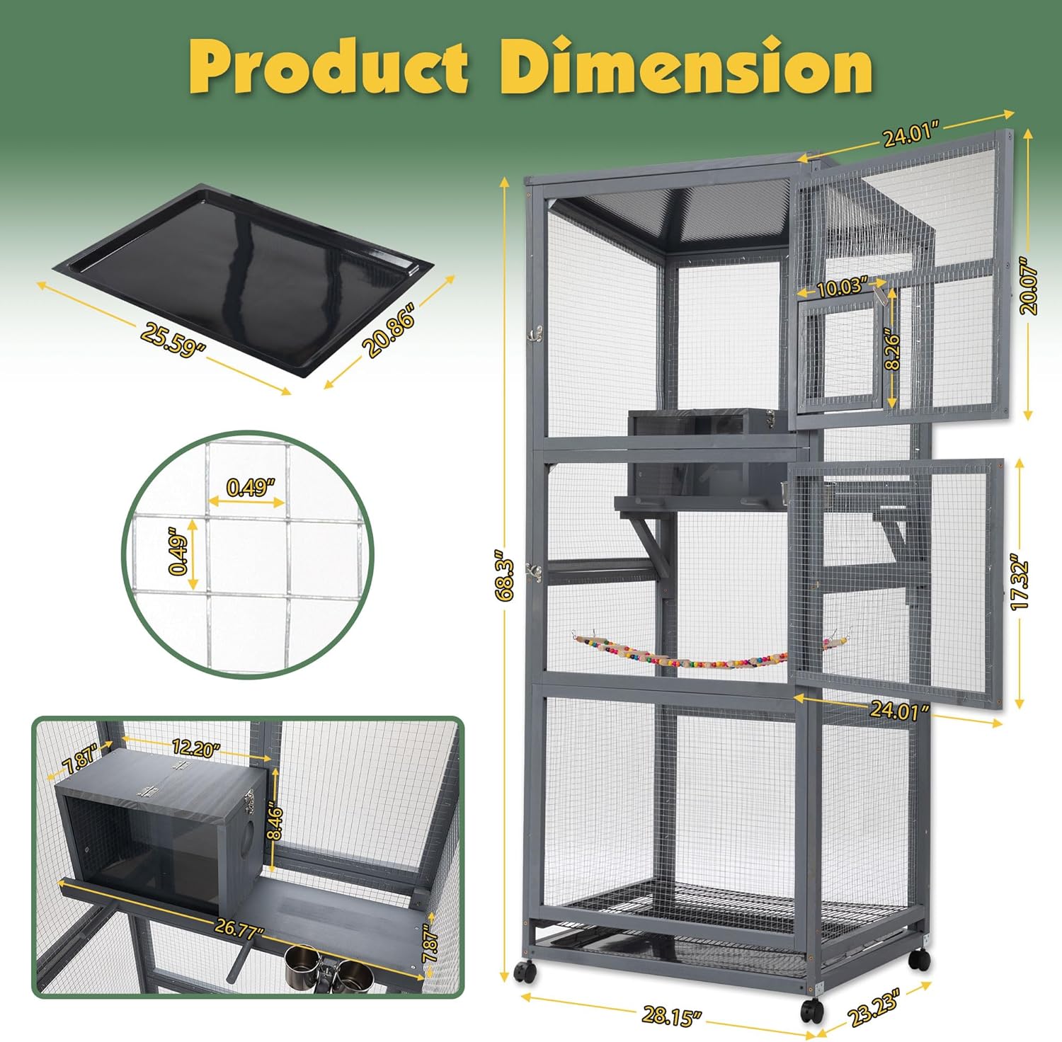 Coziwow 68" H Large Wood Bird Cage on Wheels, Outdoor Bird Aviary Indoor Wooden Large Bird Cage Parakeet Cage with Pull Out Tray and Feeder,Ideal for Small Birds,Finches,Parrots, Gray
