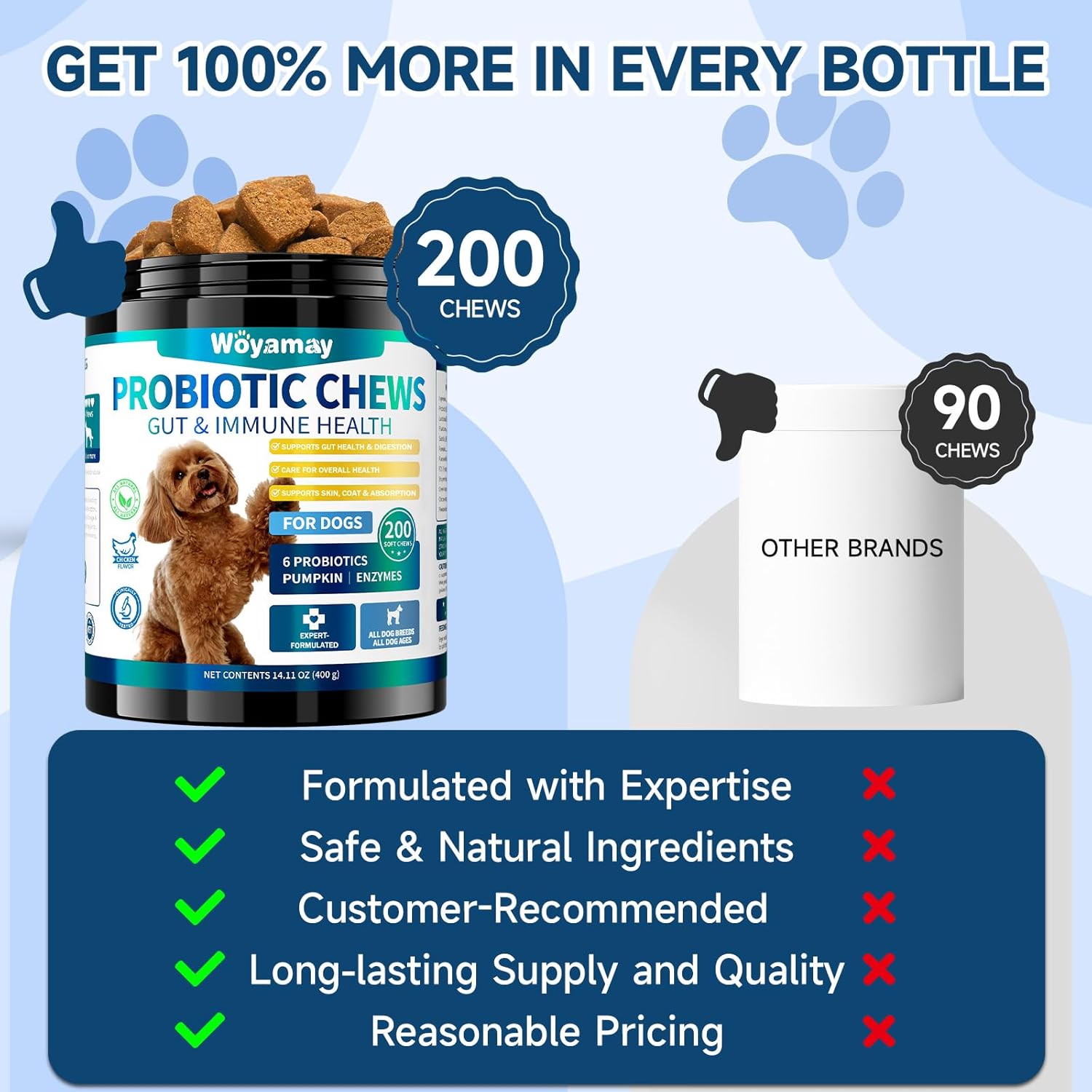 - 200 TREATS PROBIOTIC VALUE PACK: Each bottle of dog gut health probiotics chew contains 200 chewable probiotic chews for dogs, providing continuous gastrointestinal support for 2-3 months and reducing the need for frequent purchases. With long-term use, you’ll see the positive effects of these pet probiotic chews on your dog’s health, offering comprehensive care for your pet