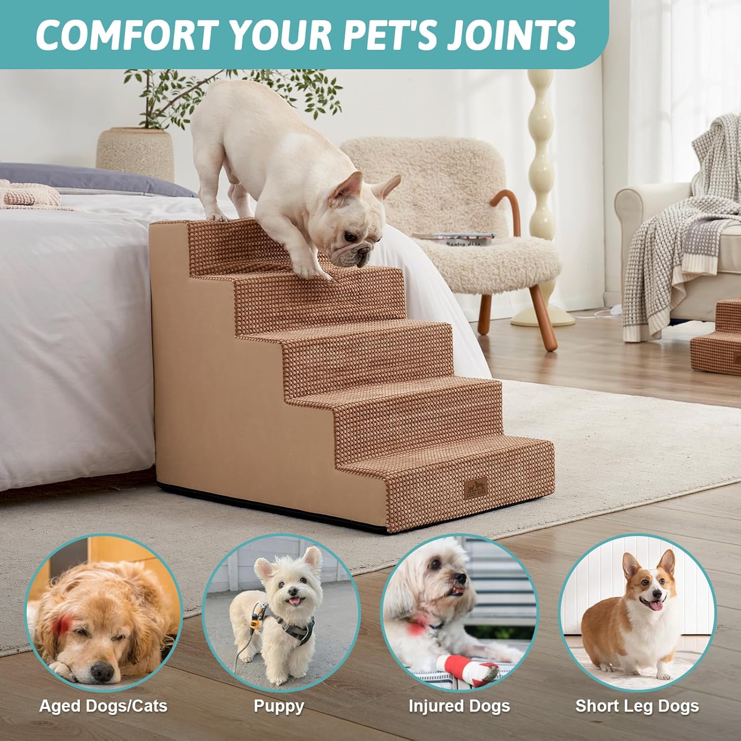 - Pet-Friendly Premium Materials: The stairs for dogs to get on beds are made with 30D high-density foam, providing sturdy support and a soft contact surface, reducing joint stress for pets repeatedly jumping onto high beds, sofas, sectionals, or cars. The stairs are covered with premium non-slip corduroy, ensuring extra stability and comfort for your pet