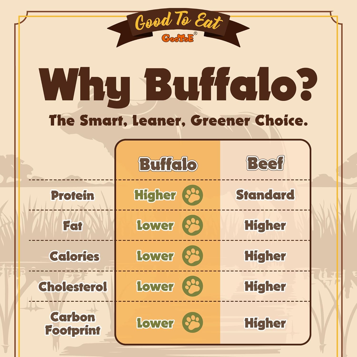 - Healthier & Tastier: Buffalo is a lean protein with less fat and fewer calories than beef, making it a nutritious choice for your dog. Naturally rich in essential nutrients and beneficial fatty acids, it supports a shiny coat, healthy skin, and overall well-being.