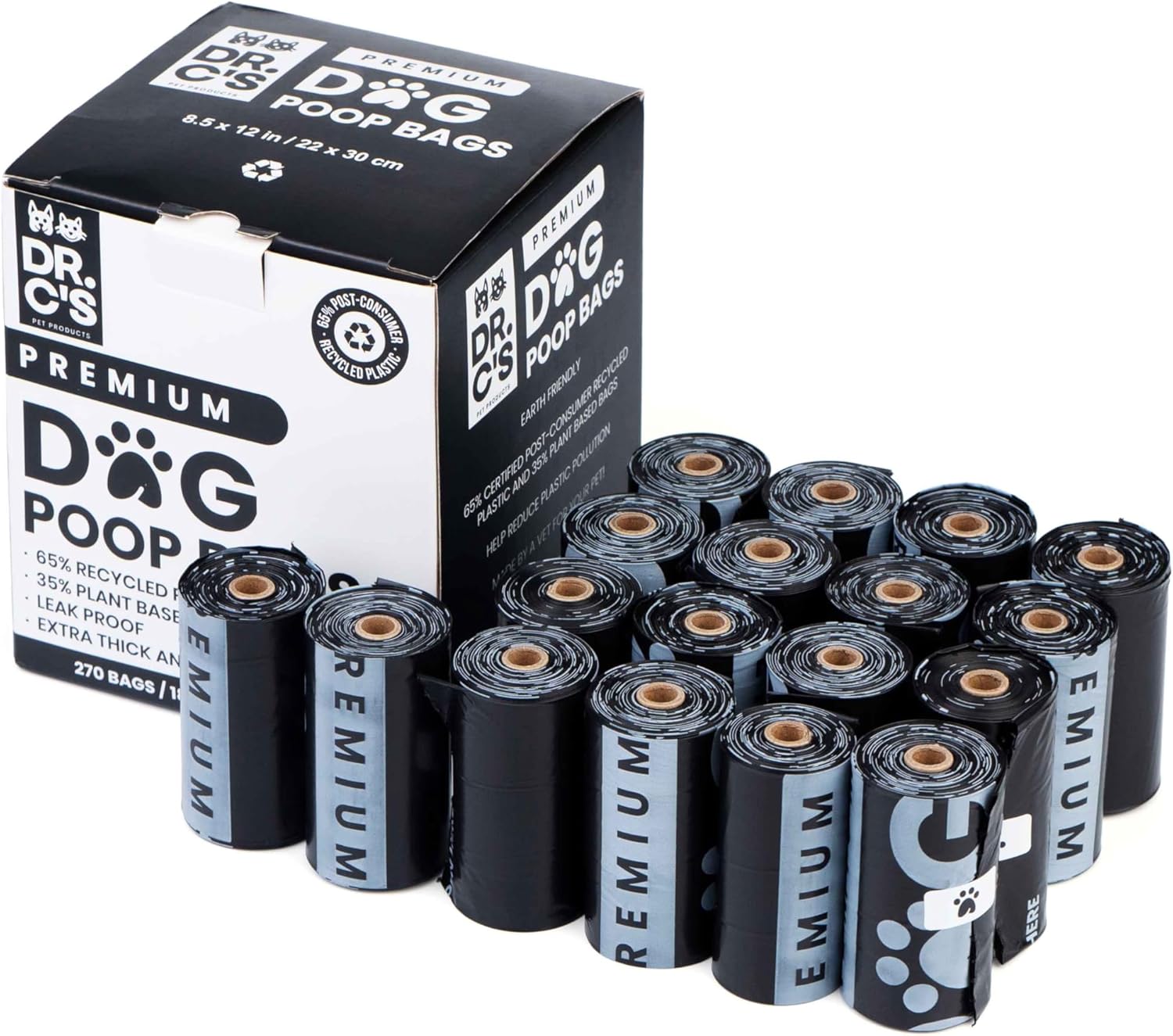 Certified 65% PCR (Post Consumer Recycled) Plastic and 35% Plant Based Dog Poop Bags - Dr. C's Premium Dog Poop Bags - 270 Bags / 18 Rolls, Extra thick, Leak Proof, Unscented, Earth Friendly