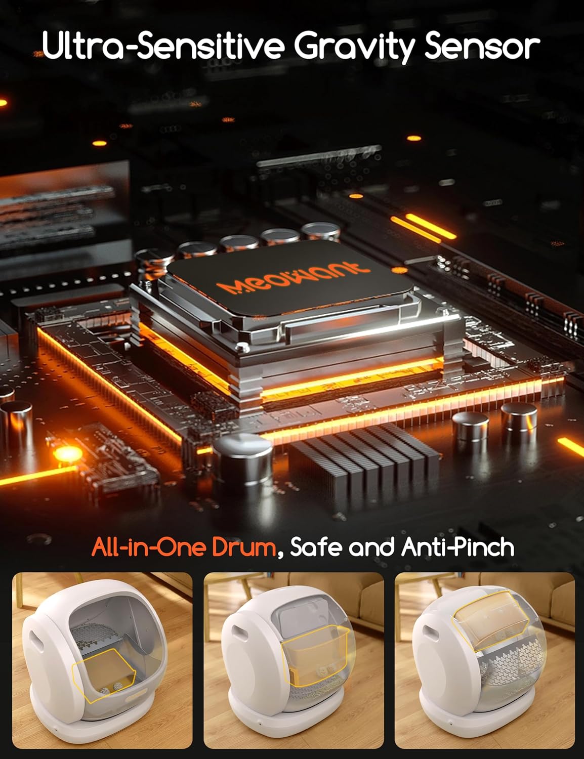 - Anti-Pinch & Safety Alerts: With a unique built-in anti-pinch design, this automatic litter box ensures your cat won't get caught between the litter chamber and the drum. Itβs equipped with 9 high-precision sensors for weight detection, motion stopping, and safety alerts to keep your furry friend safe. Please avoid placing a mat under the litter box to prevent weight measurement errors