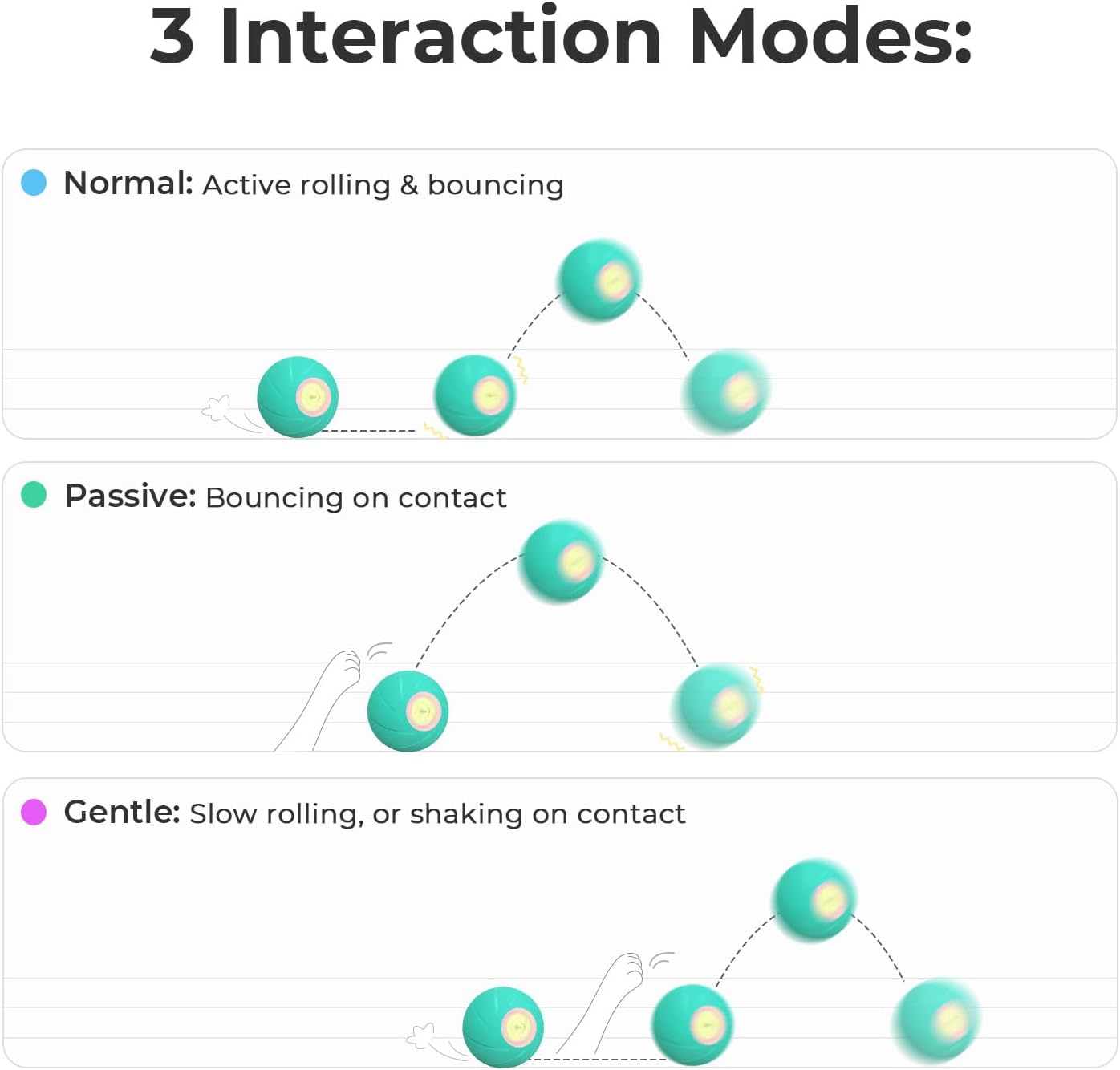 • 【3 Interactive Modes】As a mentally stimulating and entertainment toy for dogs, Cheerble Wicked Ball PE is specially designed for active or timid puppies or bored adult dogs. Upon being turned on, it will automatically roll, shake or bounce. There are 3 interaction modes: Passive, Normal, and Gentle among which you can switch to make it suitable for different dog plays. The cool LED light will also be turned on to catch your dog's attention immediately.