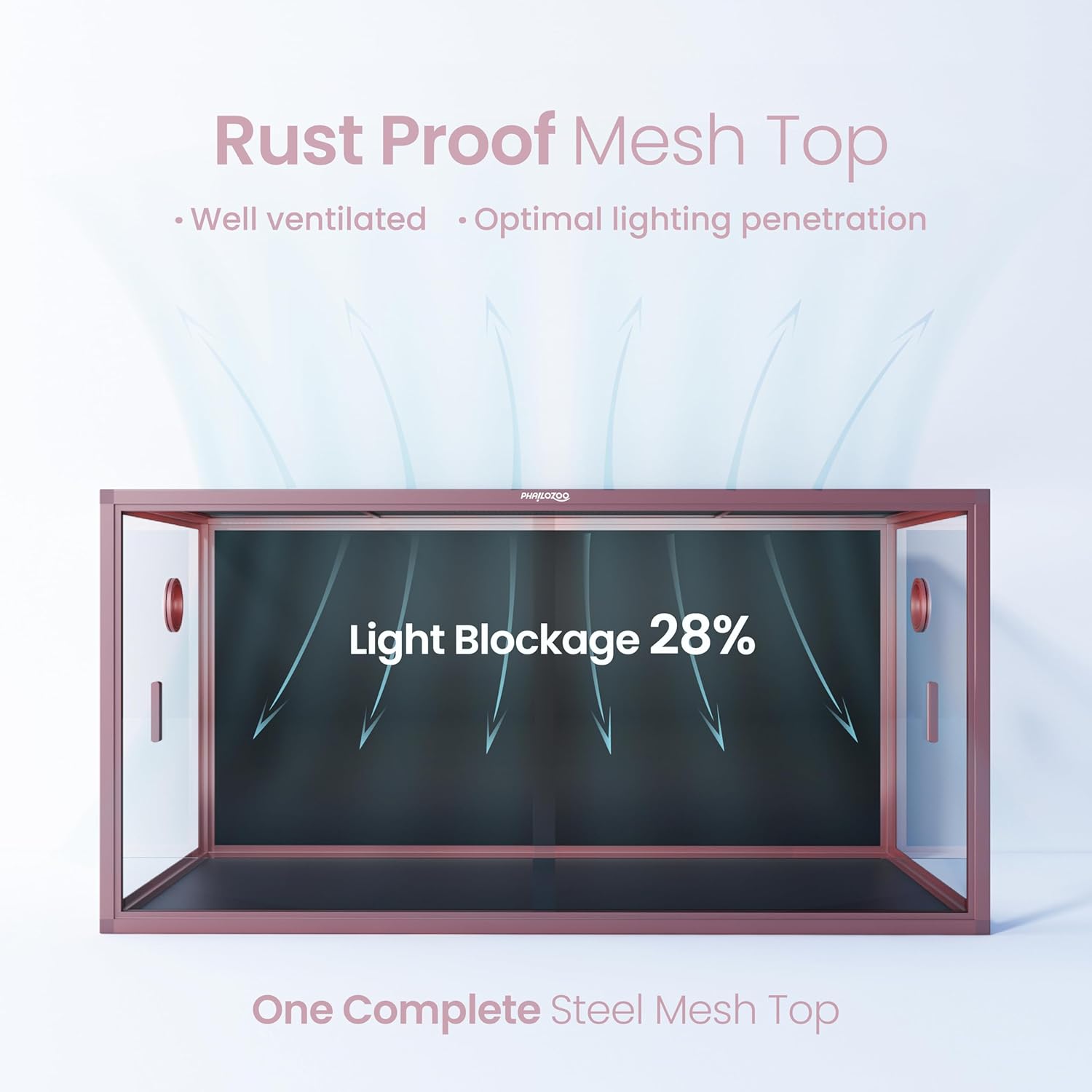 - ăHighly AdaptiveăWell-lit screen top with only 28% blockage. Compatible with many reptile accessories and equipment, such as heat lamps for reptiles, reptile humidifiers, reptile misters, reptile foggers, reptile UVA and UVB. Our reptile terrarium is great for holding temps and humidity.