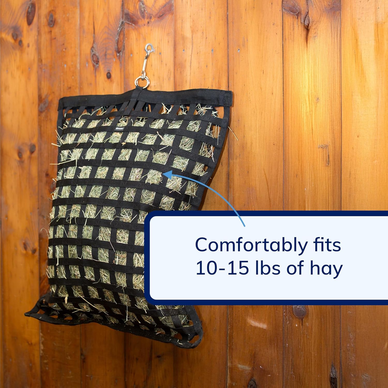- Easy Loading: The slow feeder bag’s gator mouth enclosure ensures the hay stays firmly in place; The 2-flake size can easily hold up to 10-15 lbs of hay, ensuring your horse can feed easily and constantly, especially useful when stall-bound