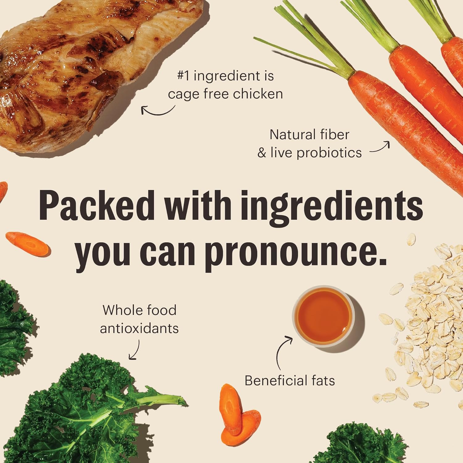 - HUMAN GRADE: High quality, human grade ingredients such as cage-free chicken, oats, and vegetables. Produced to the same standards of quality and safety as the food you eat. Made in the USA with ingredients sourced from suppliers around the world.