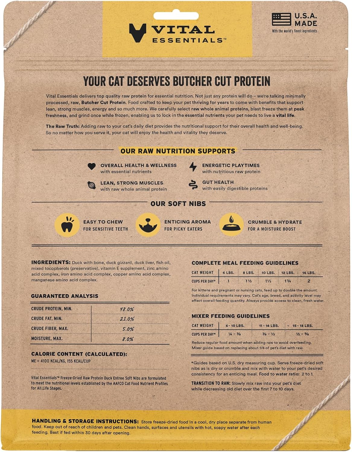 • SOFT NIBS FREEZE-DRIED RAW DUCK CAT FOOD: Vital Essentials Freeze Dried Cat Food packs more protein than industry standard into every soft bite to deliver the peak vitality your cat deserves, especially when compared to dehydrated cat food. Our complete and balanced freeze-dried raw cat food is made with Butcher Cut premium duck, responsibly sourced in the European Union.