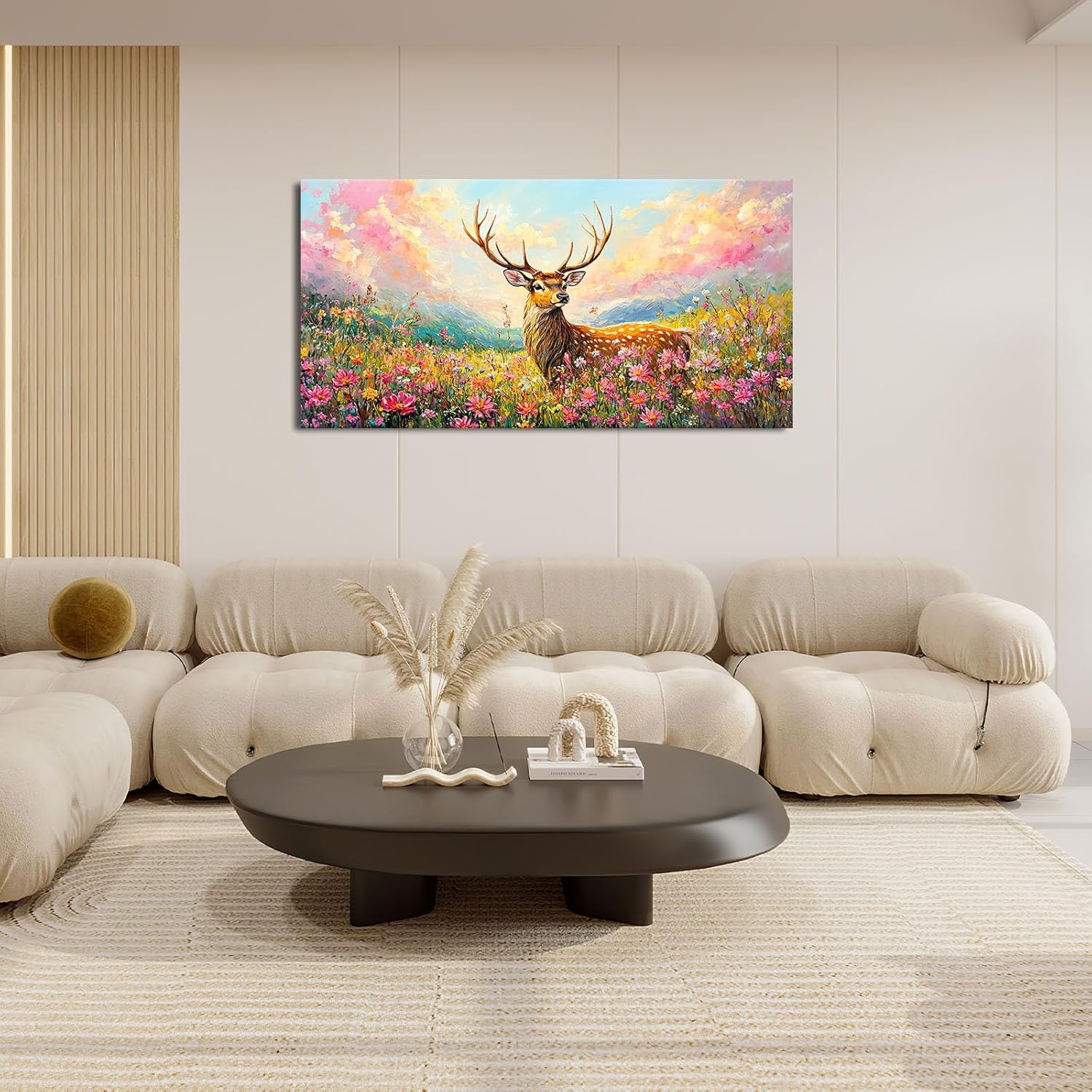 - 【Unique Design】A beautiful deer in the colorful flowers, bright colors, clear strokes. The background is characterized by mountains, sky and clouds, full of colors, lively animals and a dreamy feeling.