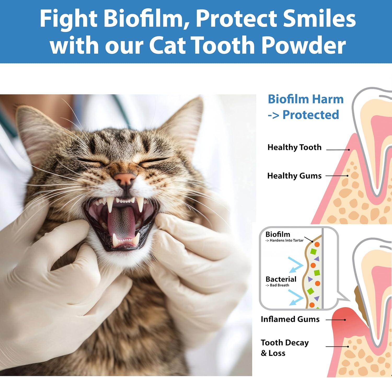 - Plaque & Tartar Control: This cat plaque off powder works with saliva to break down biofilm; softens existing tartar; and prevents further buildup. Regular use helps maintain a cleaner mouth and reduces the risk of dental disease, supporting long-term oral health for cats.