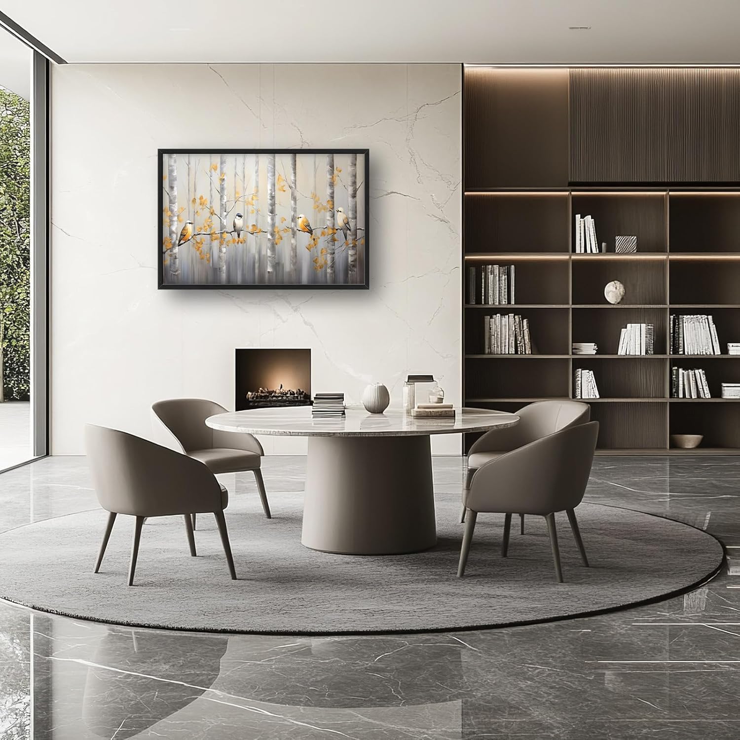 - 【Unique Design】Abstract painting of silver birch trees with birds, yellow leaves, white background, gold accents, soft lighting, neutral tones, modern style, wide frame, oil on canvas, brush strokes, elegant composition, nature-inspired artwork.