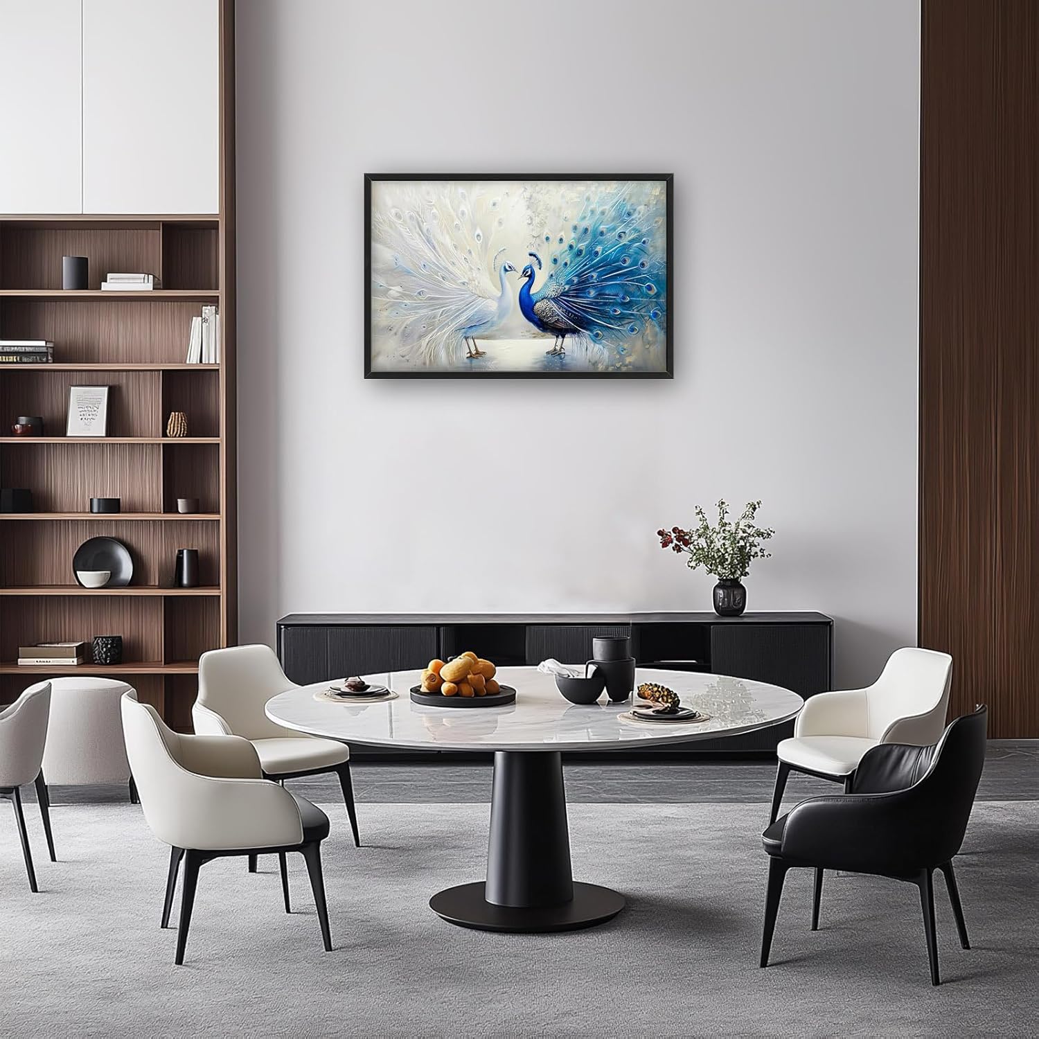 - 【Unique Design】Blue and white peacock painting, oil on canvas, two beautiful peacocks with long tails, white feathers spread out in the background, exquisite feather details, elegant posture, gorgeous colors, symmetrical composition, soft lighting, and romantic atmosphere. The background is blurred to highlight the theme of the peafowl.