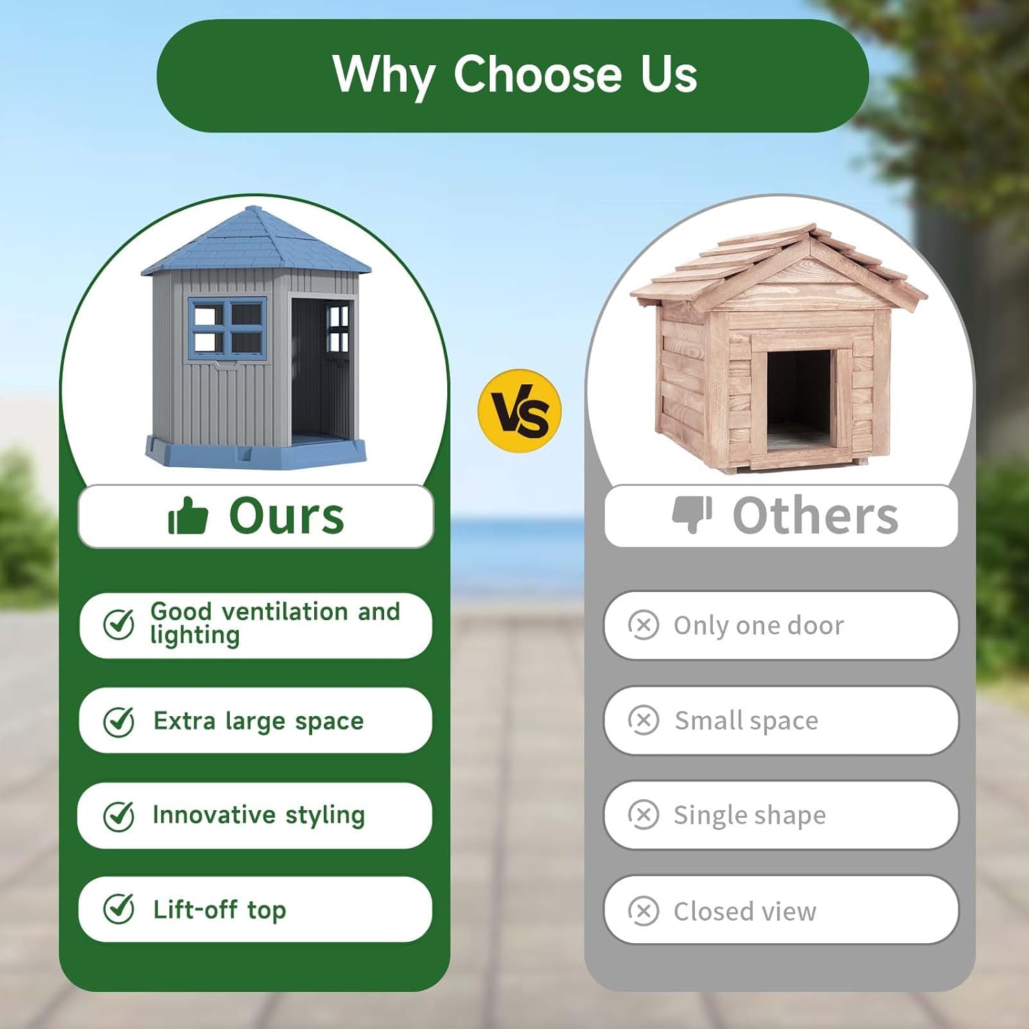 - WEATHER-PROOF STRUCTURAL DESIGN: Our dog houses have approximately 3 inches of floor compartment on the bottom. The raised floor design prevents dirty water from flowing into the kennel, which prevents the kennel from warping or leaking due to water buildup, and prevents your pet's paws from feeling uncomfortable on icy or hot floors. The waterproof removable roof provides great convenience for cleaning your dog house.