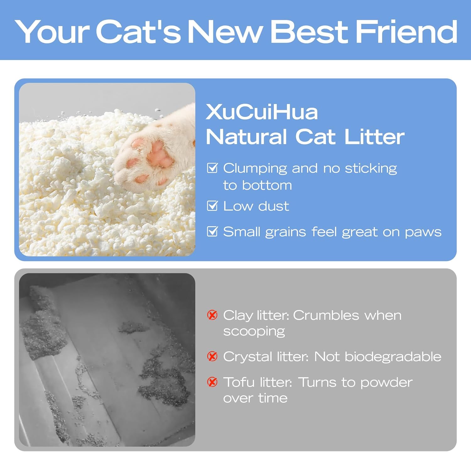 - LOW DUST: Minimal dust while pouring or scooping keeps the air clean—better for your cat’s breathing and your furniture. No silica or clay dust for a truly dust-free cat litter experience.