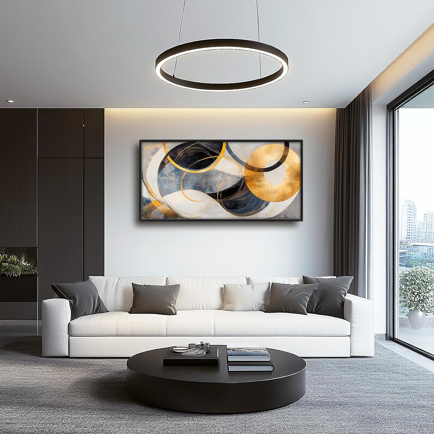 Large Abstract Wall Art for Living Room, Oversized Abstract Circle Wall Decor, Black and Golden Abstract Canvas Painting Modern Artwork Home Decoration for Living Room Bedroom Office Framed 60"x30"