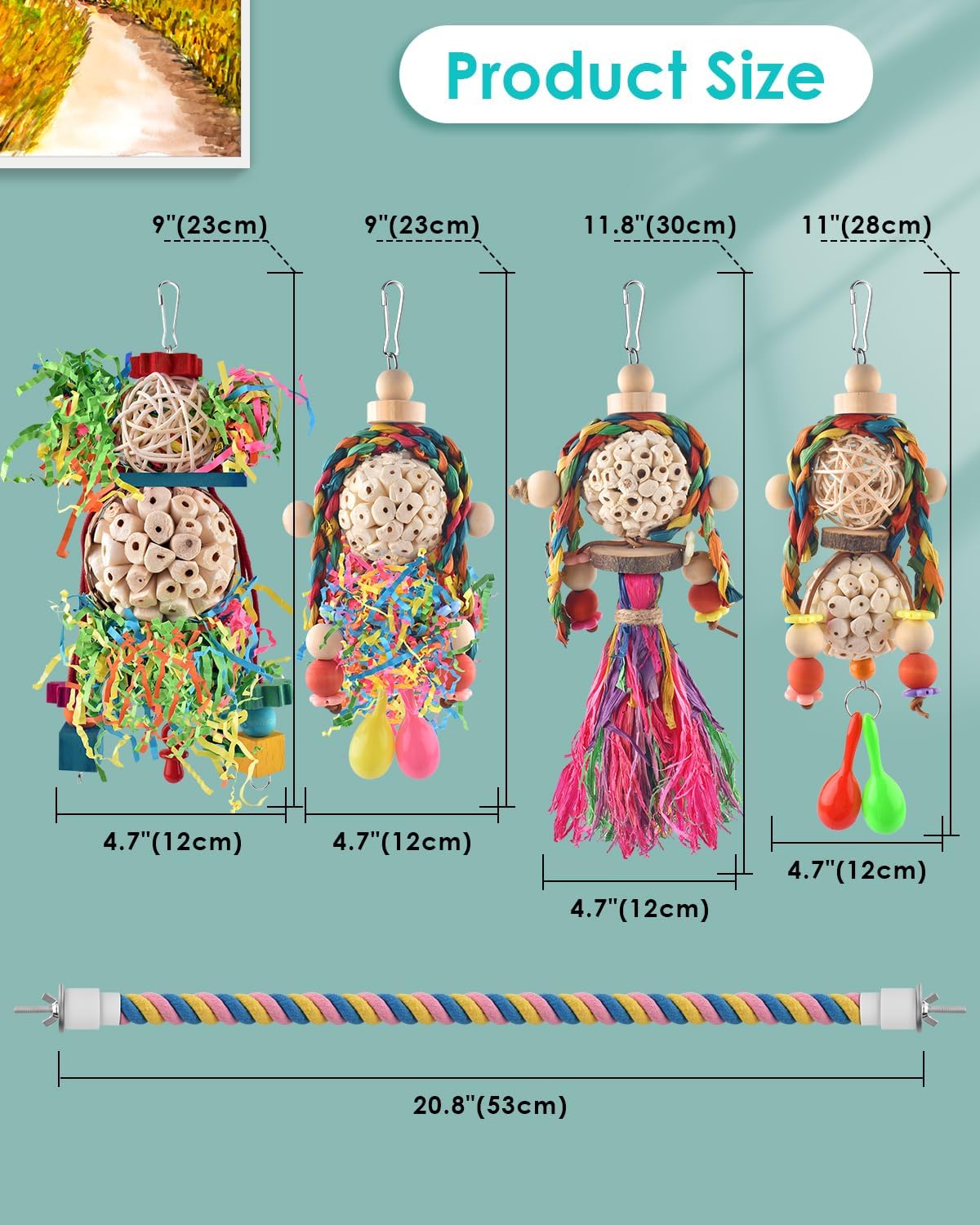 - Reference Size: Please refer to Image 2, it has 4 different sizes. The paper strips are not glued to the toy. They will fall out when the bird pulls or chews. It is normal for a small part of this kind of colored paper scraps to fall off