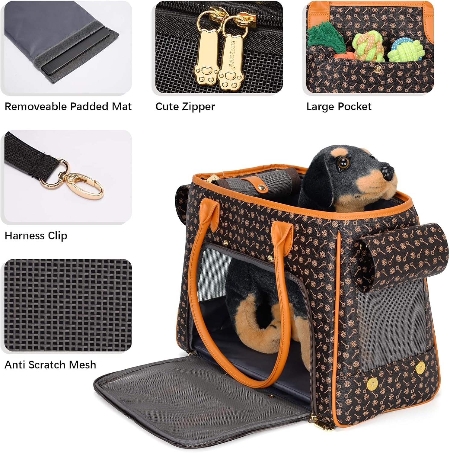 Minsong Fashion Pet Carrier Purse for Small Cat and Dog, Luxury Pu Soft-Sided Tote Bag with Large Pockets for Dogs and Puppies (Coffee, 15.8" L x 7.5" W x 11.8" H)