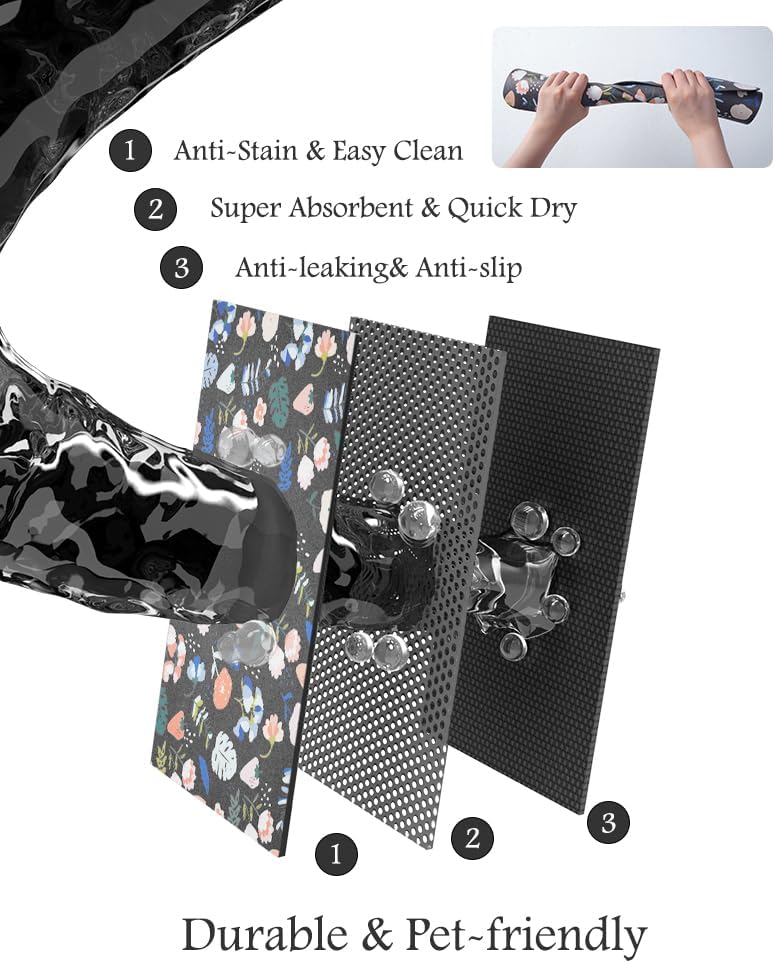 • Super Absorbent & Durable: Perfect pet supplies.This pet food mat can prevent liquid from overflowing. Super absorbent and quick-drying ability to avoid wetting pet paws even for messy drinkers. Sturdy dog & cat food bowl mat cannot be torn easily and avoid eating by mistake. Keep the pet's eating environment tidy and clean.
