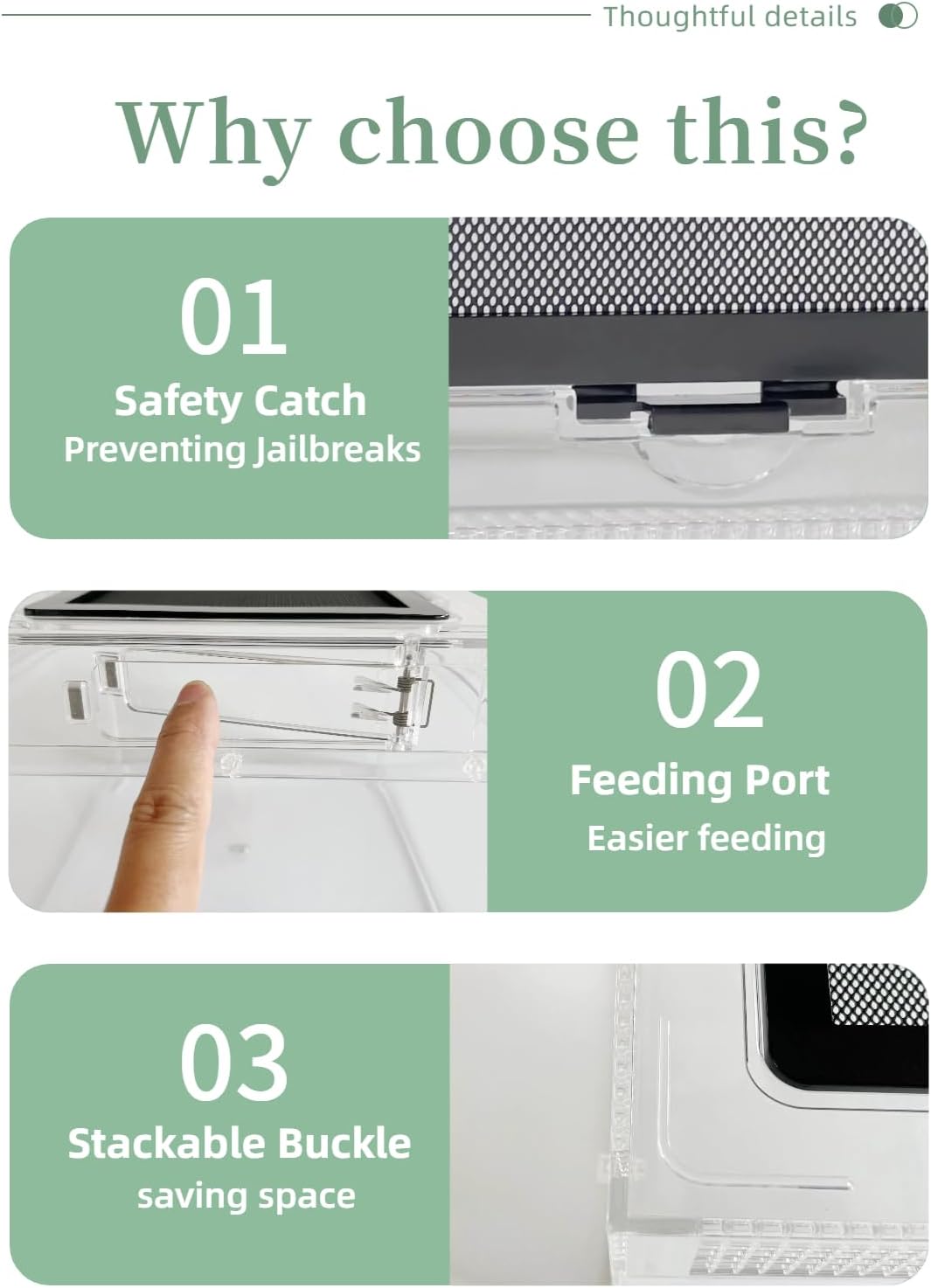 - 【No Assembly Required】:the tank forms a one-piece, waterproof structure—no assembly required. The front magnetic feeding window simplifies feeding routines while ensuring an escape-proof design, ideal for hermit crab enclosures, jumping spider enclosures, and other small reptile habitats.