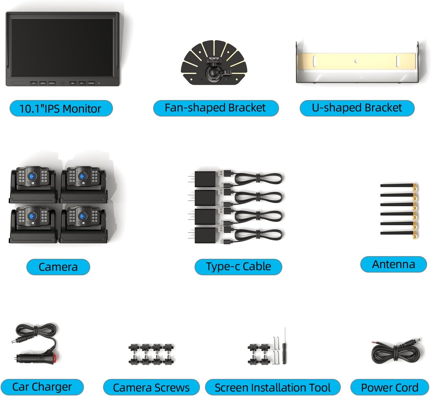 - 10.1" IPS Monitor & IR Night Vision:With high resolution of 1080 pixels, the larger monitor gives us broader and clearer image, the cameras offers a 150° wider view, so that we can drive with a pleasant mood
