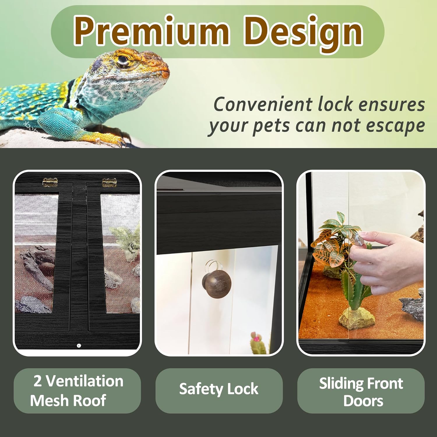 - 【Thoughtful Functional Design】Equipped with double sliding glass front doors for smooth access, the enclosure also includes a secure locking mechanism to keep your pet contained. The metal mesh top promotes proper ventilation and is ideal for mounting heat lamps or UVA/UVB lighting (not included), maintaining optimal living conditions for your reptiles.