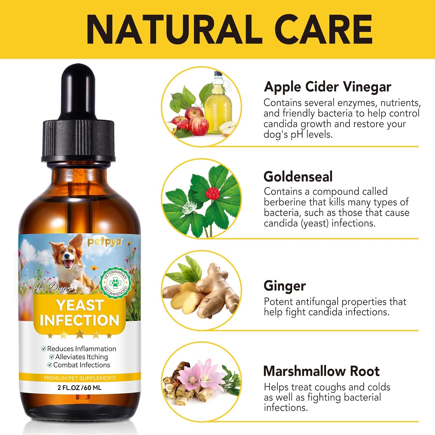 - Organic Ingredient - This potent anti-inflammatory supplement contains ingredients such as ginger, apple cider vinegar, goldenseal, and Pau D'arco that work together to combat candida infections, restore pH levels, eliminate harmful bacteria, and reduce inflammation in your pet.