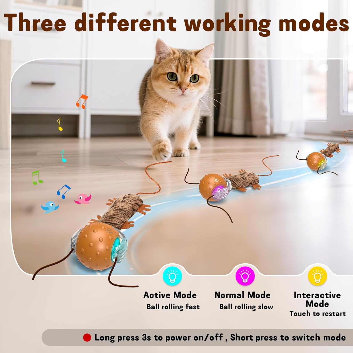 - 【Different Modes of Operation】:Regarding our interactive cat toy, it has three different modes of operation: fast and slow mode and interactive mode, and it is accompanied by realistic bird calls, which promotes the cat's movement while enhancing the cat's curiosity.