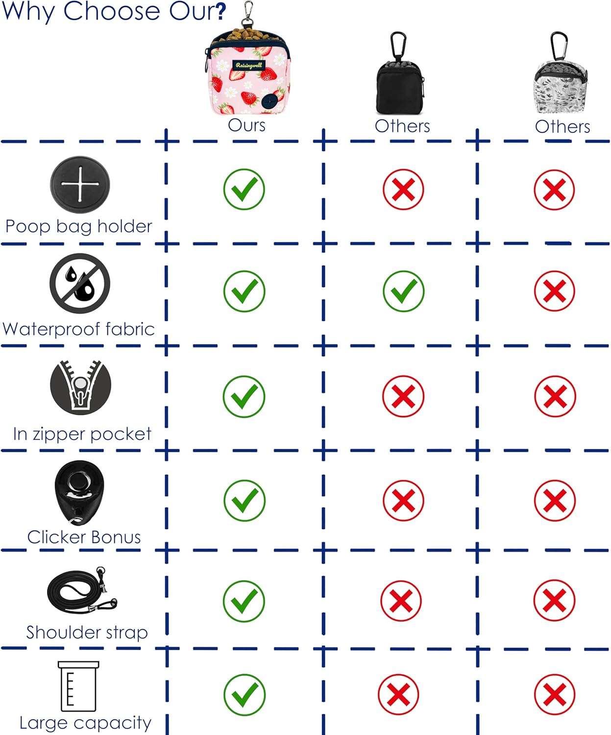 - 3、Durable Tech Material: Raisingwell's dog treat training pouchis made from durable, washable, and non-toxic fabric. Notably, its waterproof lining solves the problem of difficult-to-clean interiors of training bags.