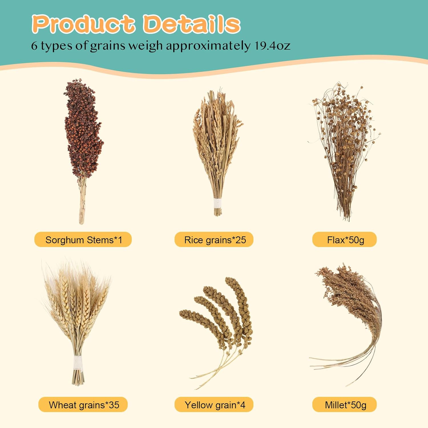 - TAOKEKE hamster spray set contains content: you will get Wheat sprays (35sticks), Flax (50g), Yellow Millet (4sticks), Sorghum Millet (25sticks),Rice(25sticks),Panicle(50g),providing safe chewing toys and foraging rich toys for warehouses, sand, mice and other small pets