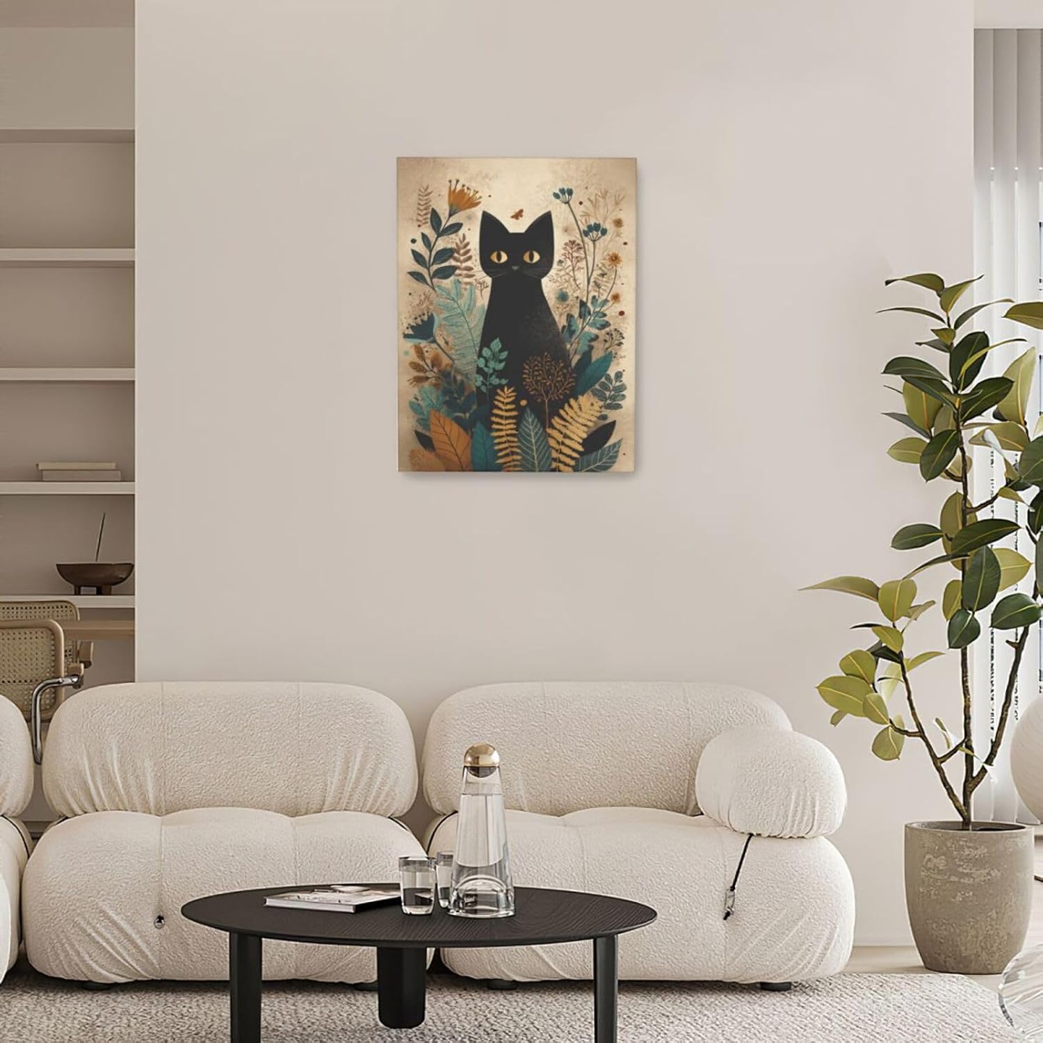 Boho Black Cat Wall Art Kitten Botanical Wall Decor Mid Century Modern Canvas Painting Print Minimalist Pictures Artwork Framed Decorations Gifts for Cat Lover Bathroom Nursery Living Room Bedroom Kitchen 12"x16"