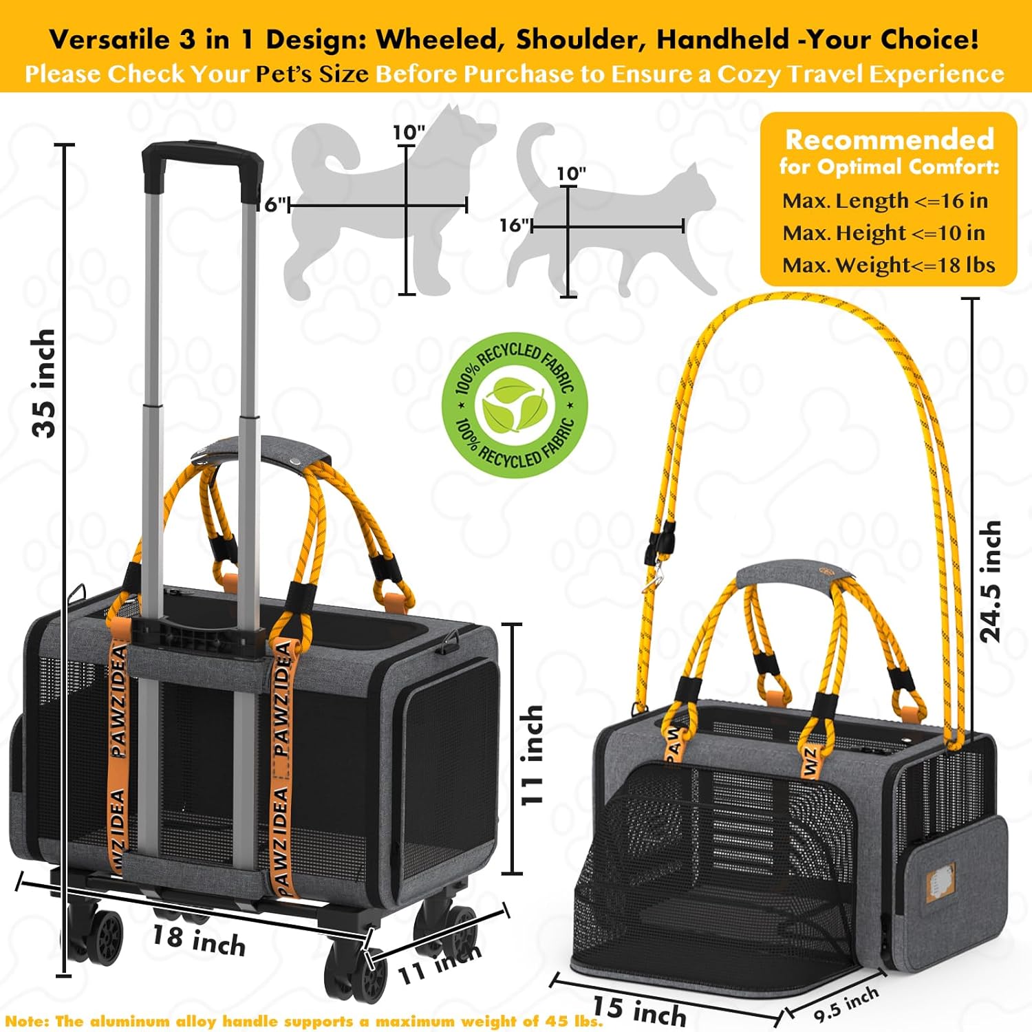 PAWZIDEA Pet Carrier with Wheels, 18x11x11 TSA Airline Approved Cat Carrier for 2 Cats Under Seat, Expandable Soft-Sided Dog Carrier for Small Dogs Rolling Travel Bag with Telescopic Handle, ID Card