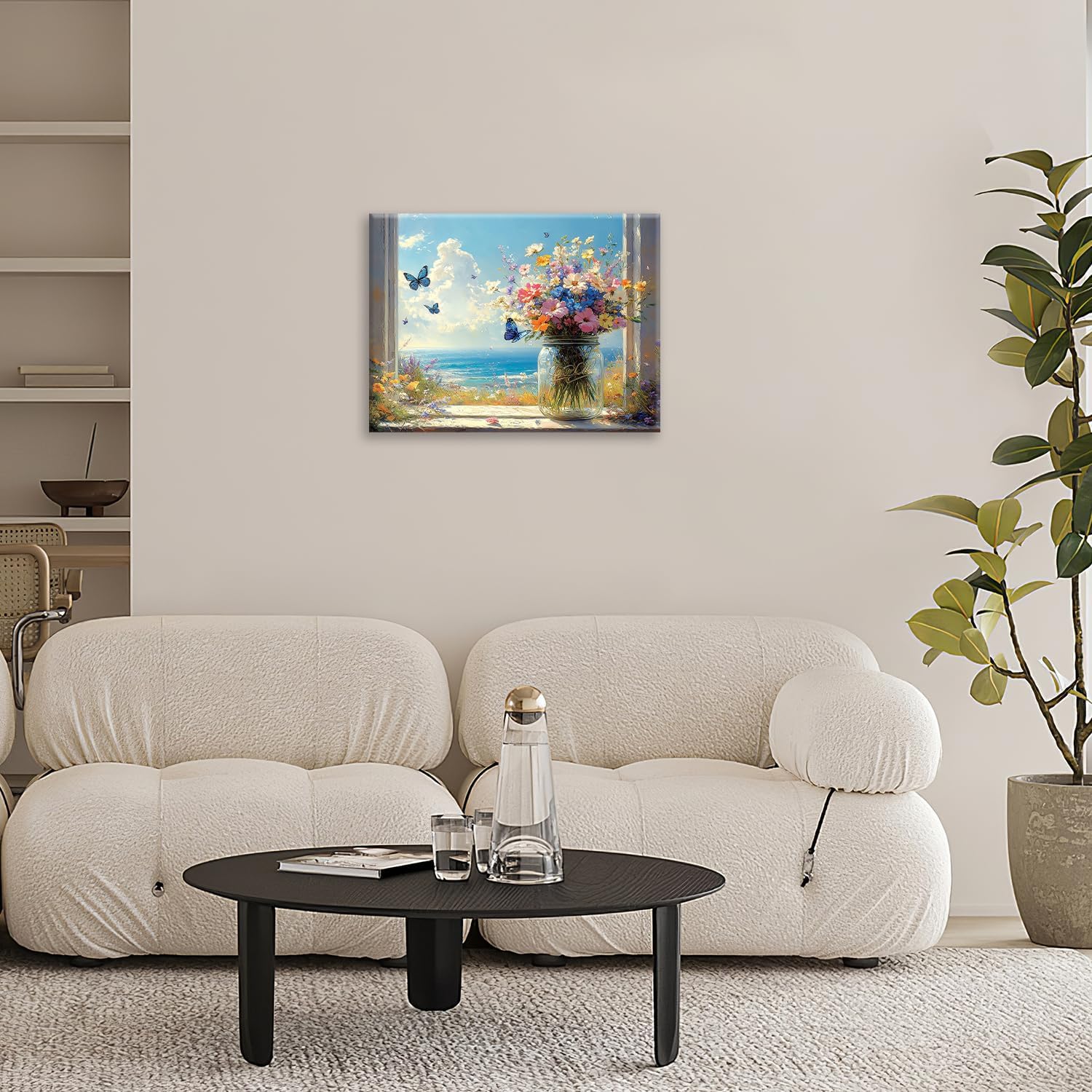 Beach Floral Bathroom Pictures Wall Art, Colorful Flower Bathroom Wall Decor, Coastal Ocean Framed Painting Canvas Artwork for Bedroom Living Room Decorations 16"L x 12"W