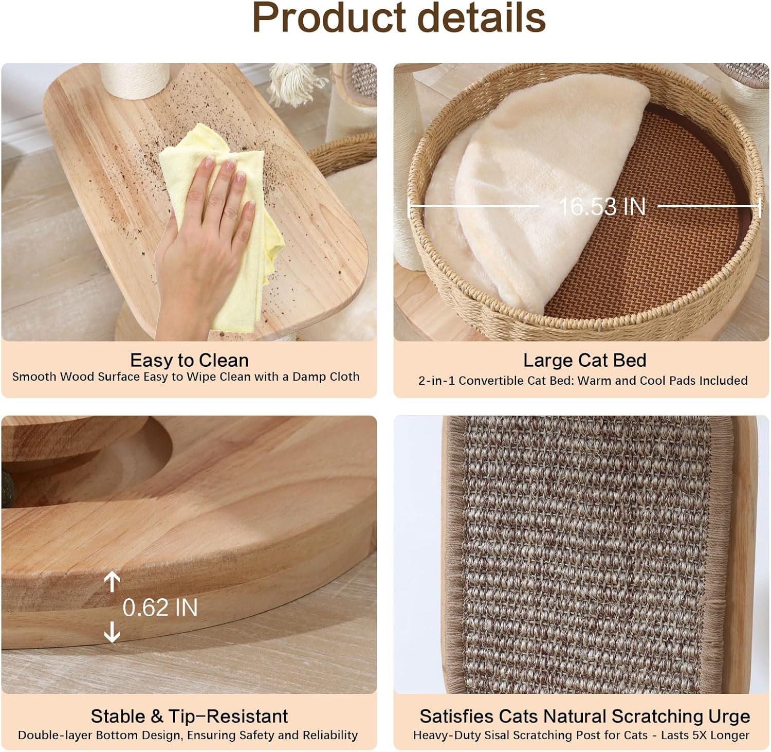 - 【Natural Materials】Crafted from pure rubber wood with 3" thick sisal posts and handwoven rattan nest. Natural sisal ropes satisfy cats' scratching needs while protecting furniture. Perfect for medium/large cats and multi-cat homes.