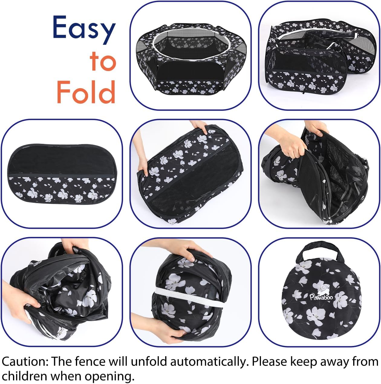 - γ NO FUSS - POP OUT IN SECONDS γοΌNo need for complex splicing, because the fence will unfold automatically, built-in frame pops open in seconds (NOTE: Please keep away from children when opening due to the spring pressure). Folds back flat when not in use for easy carrying and storing.