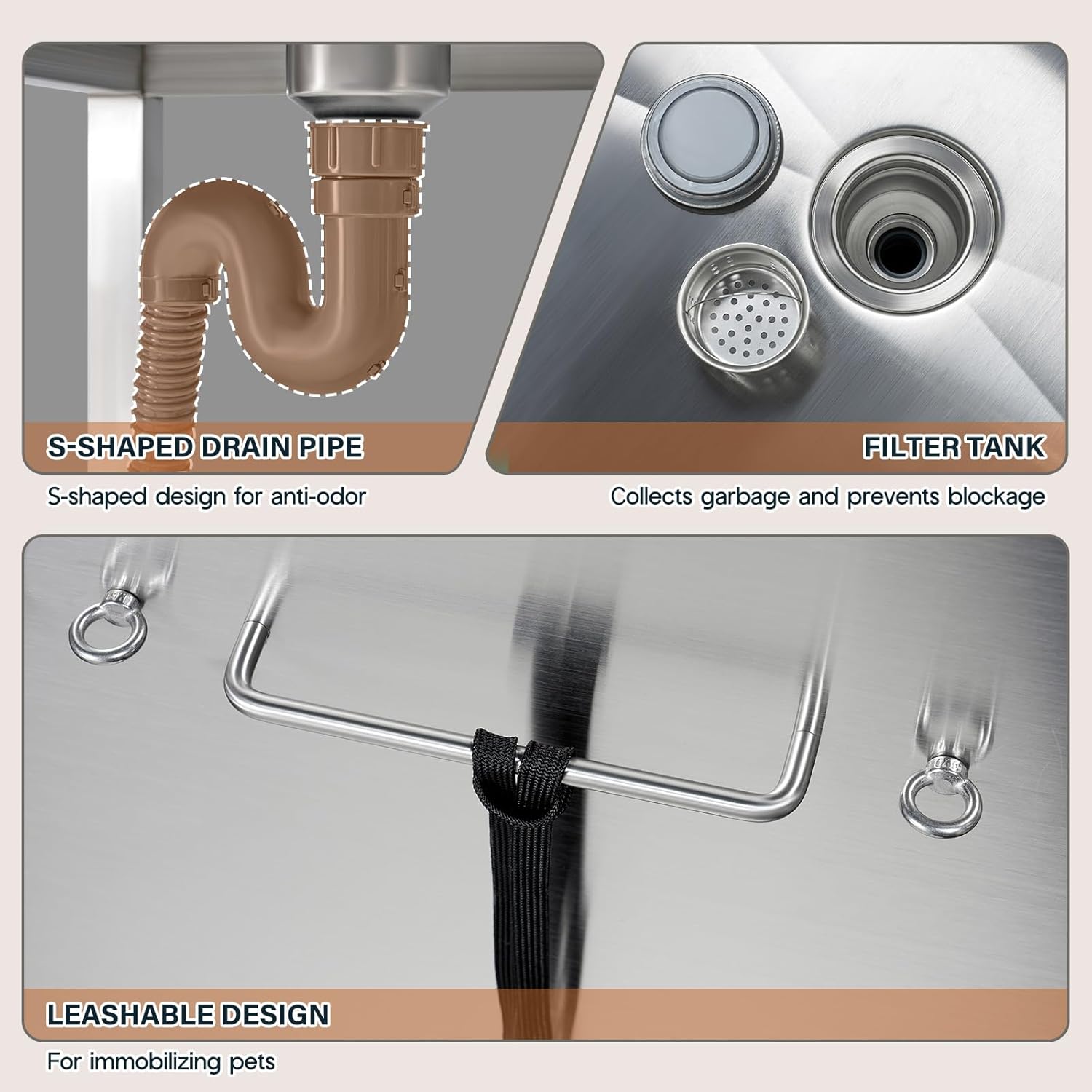 - Removable Drainage Board: The pet bathtub includes a height-adjustable and removable drain board that supports up to 550 lbs, providing safe grooming for pets of different sizes. Anti-slip pads add extra stability.