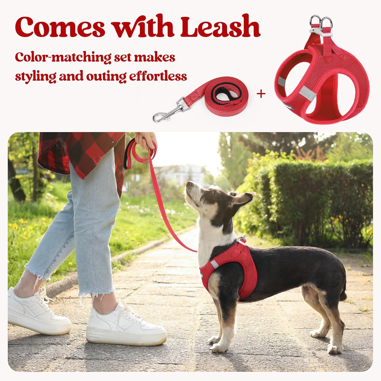 - Dog Harness with Leash SetοΌThe color-matching harness and leash with reflective bands make it fashion and visible for pet outing. The leash is 5.15ft in length, with an anti-tangling clip and a palm-friendly handle